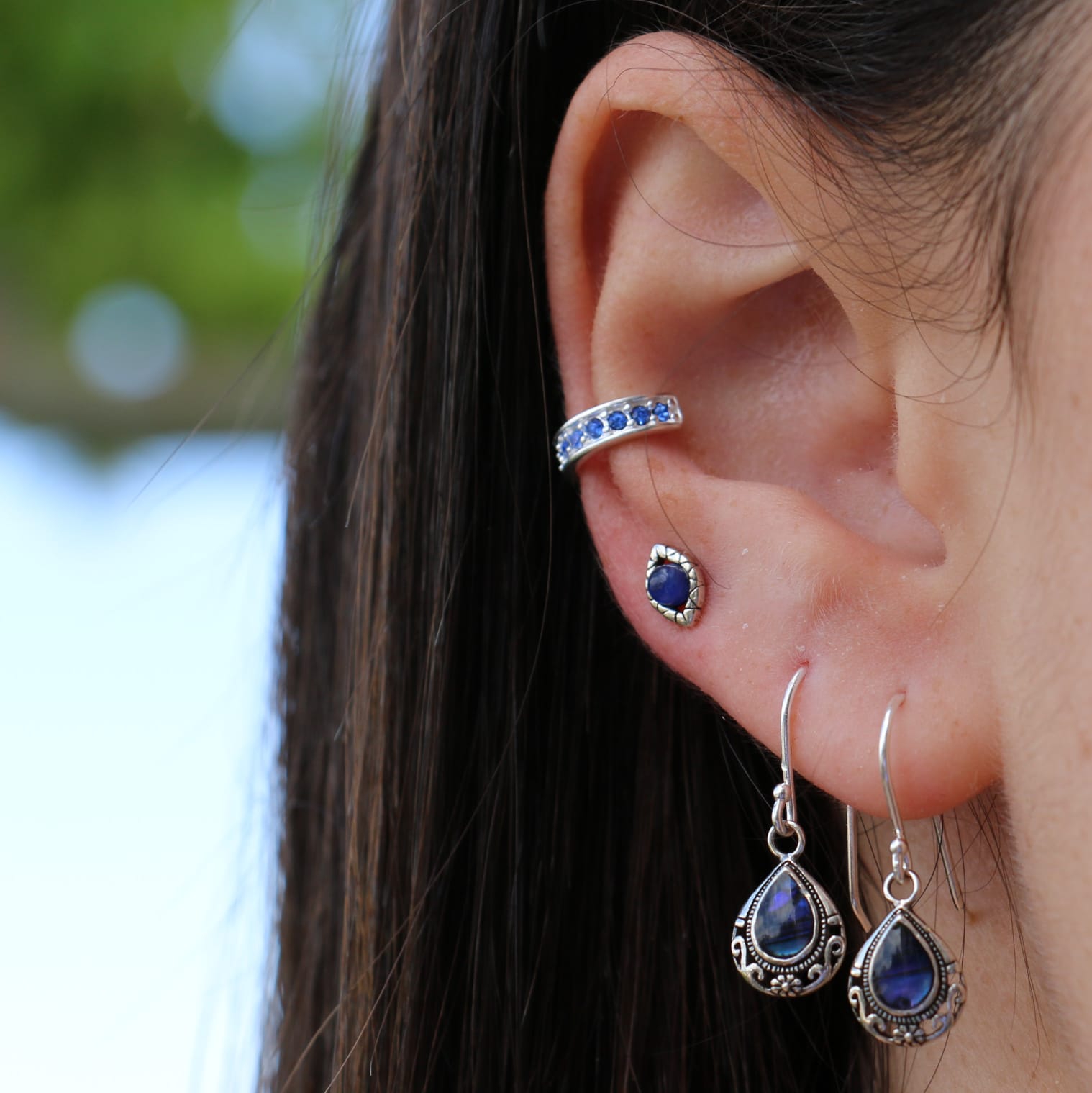 עגיל ללא חור קליפ מכסף וקריסטלים כחול