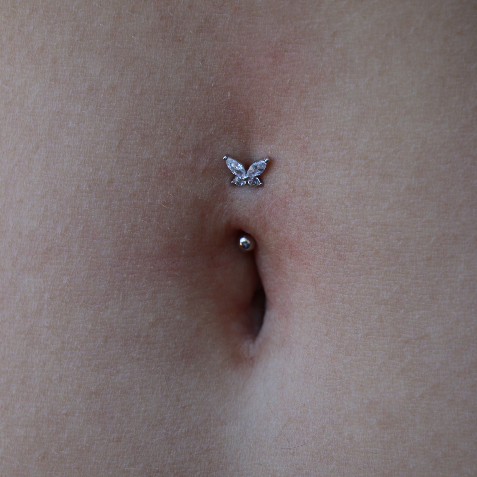 עגיל לגבה / רוק / (טבור קטנטן) בננה מזהב לבן 8 מ"מ פרפר וקריסטלים לבנים