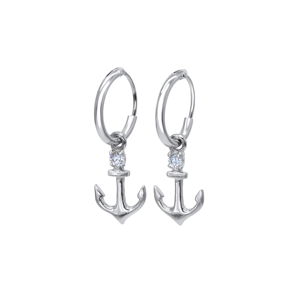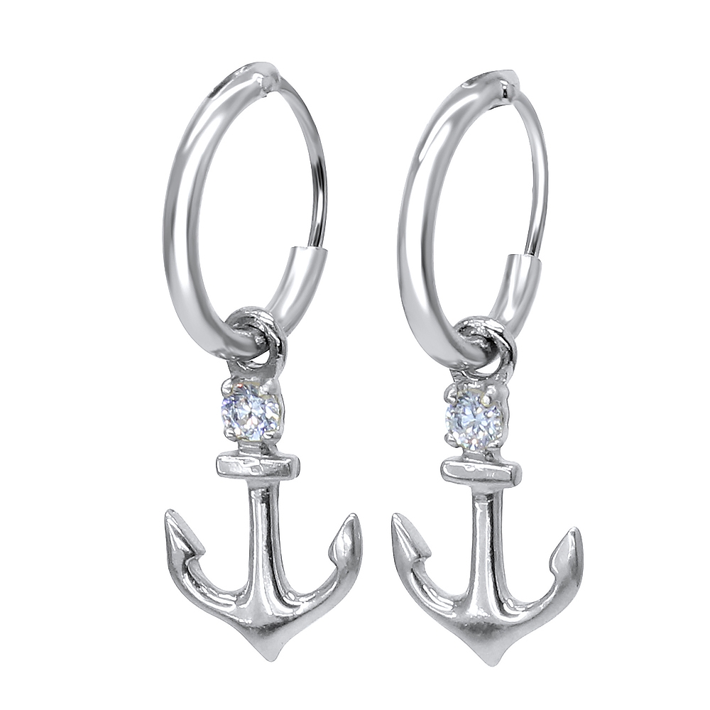 עגילי חישוק – מכסף 8 מ"מ עוגן וקריסטל לבן