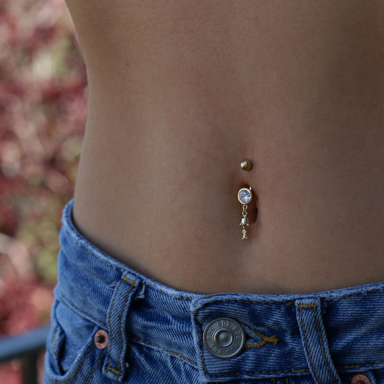 עגיל פירסינג בטבור – ציפוי זהב קריסטל עגול לבן ופעמונים נתלים
