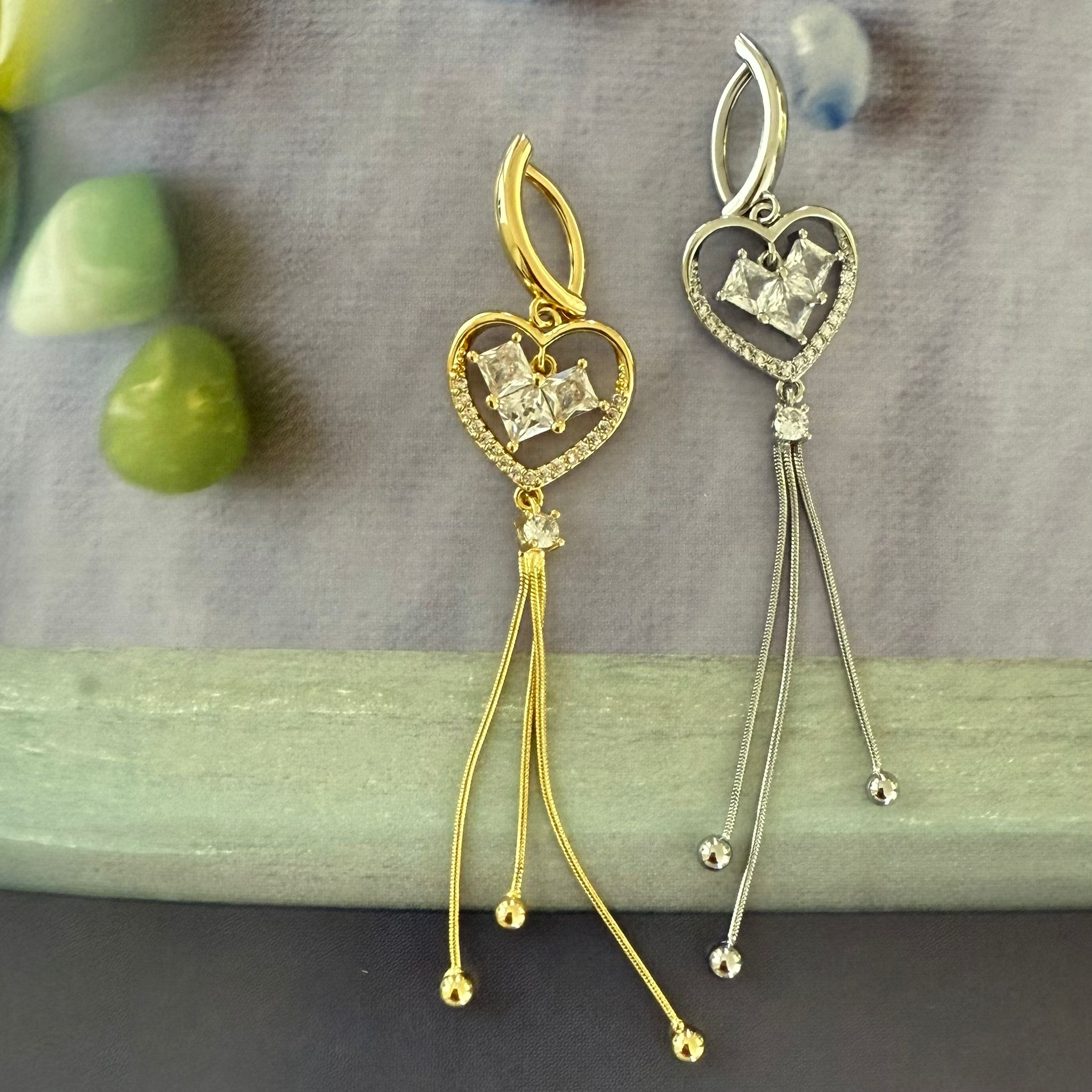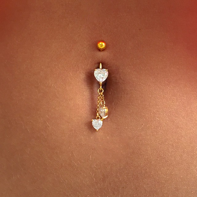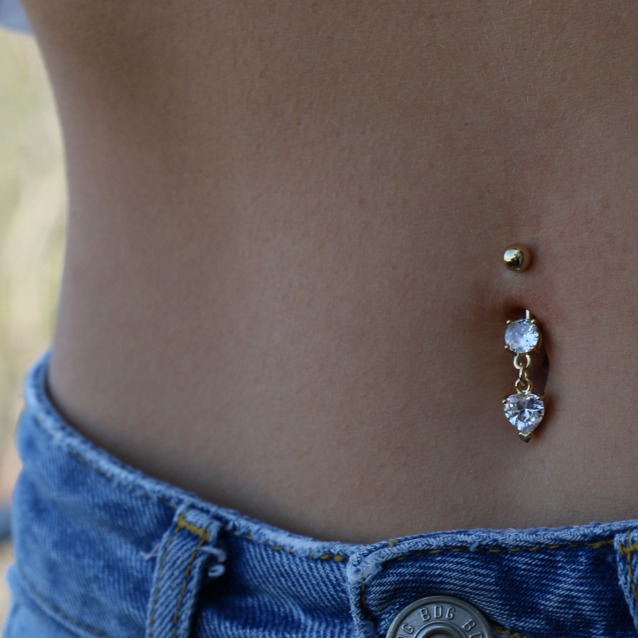 עגיל פירסינג קליקר בטבור וציפוי זהב – לב עם קריסטלים לבנים ושרשראות