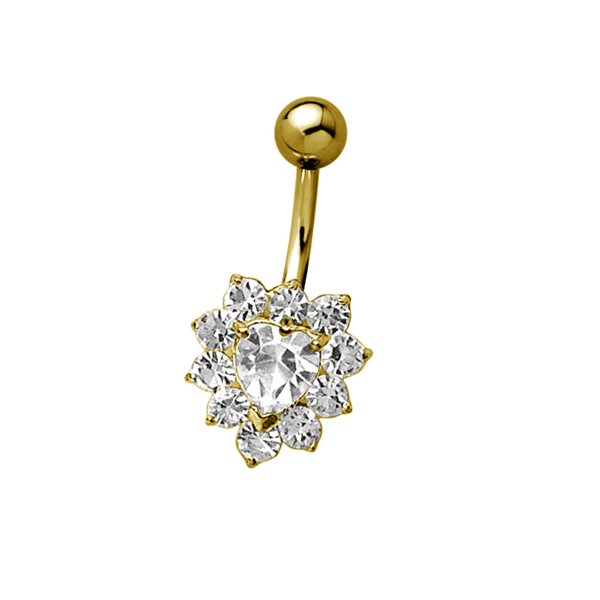 עגיל פירסינג טבור / רוק מציפוי זהב – פרח עם קריסטלים לבנים וזירקון עגול