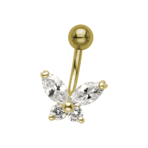 עגיל פירסינג בטבור וציפוי זהב – פרפר ושלושה זירקונים לבנים