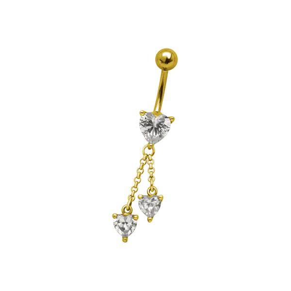 עגיל פירסינג בטבור מציפוי זהב – 2 לבבות זירקונים לבנים