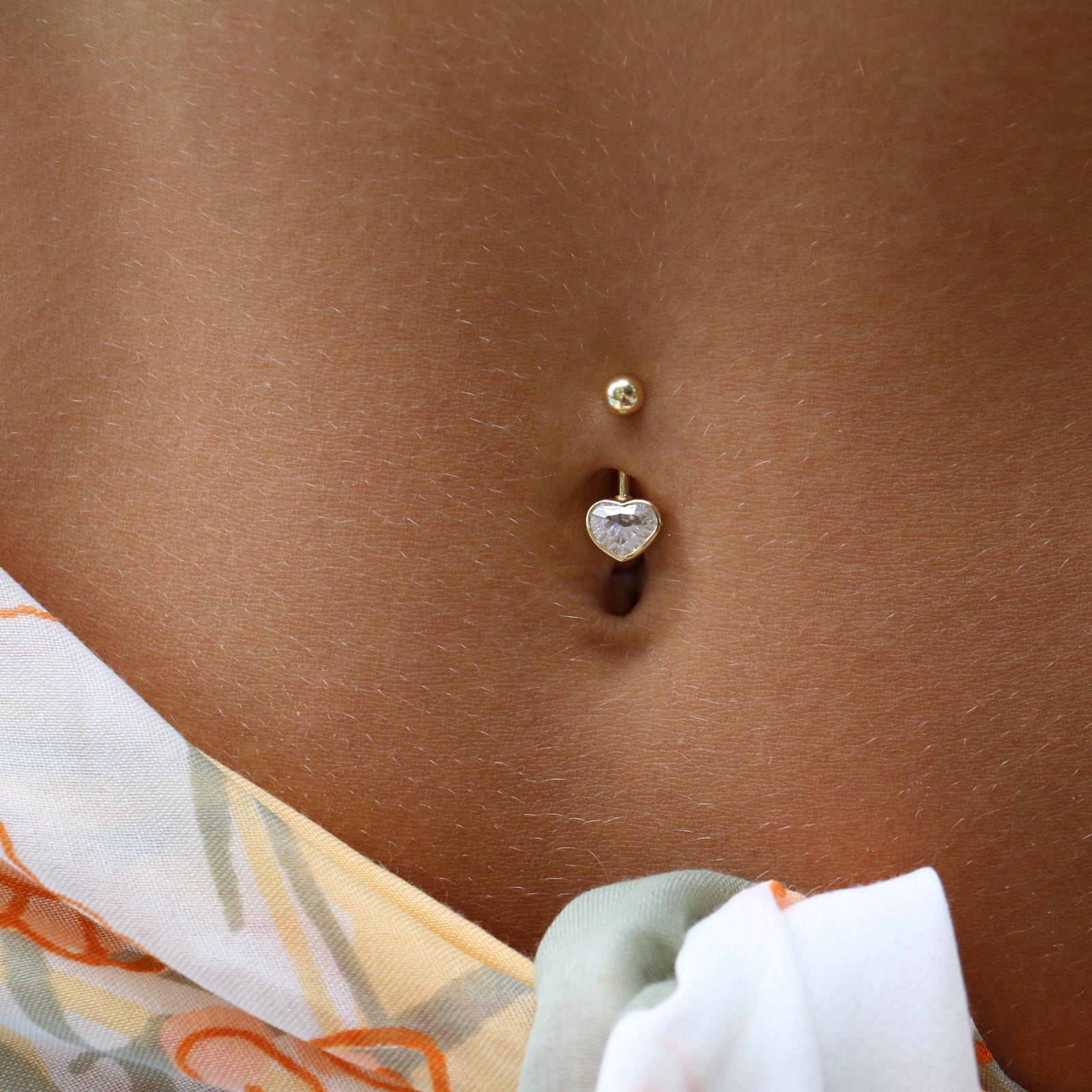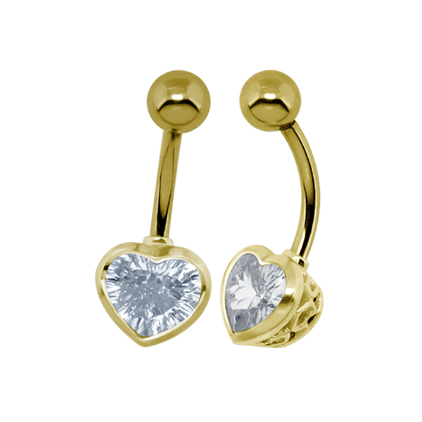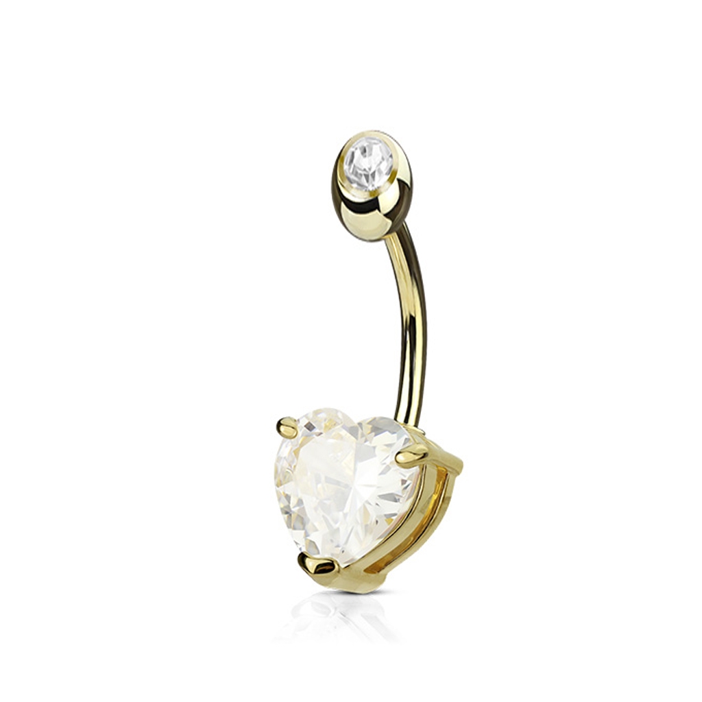 עגיל פירסינג בטבור מציפוי זהב – טבעת לחץ לב מקריסטלים לבנים