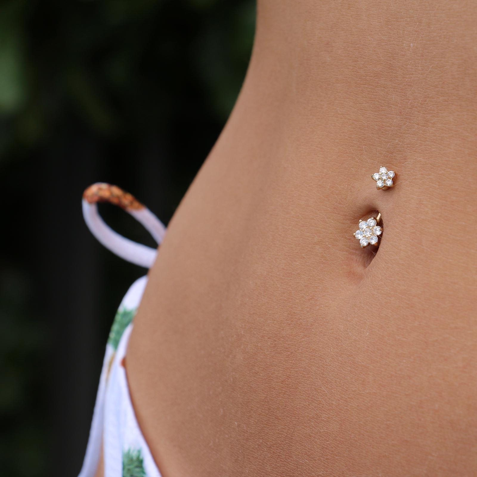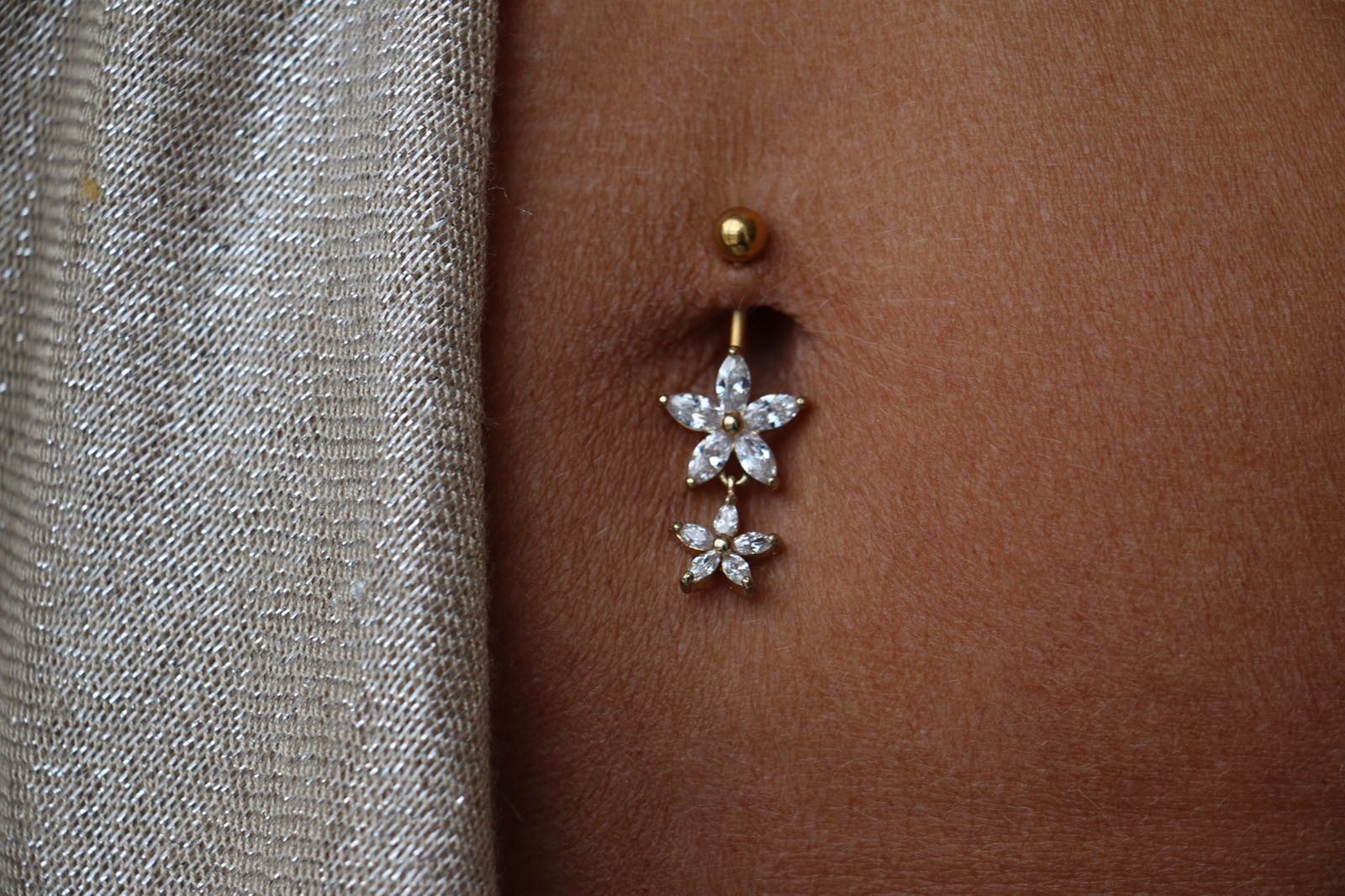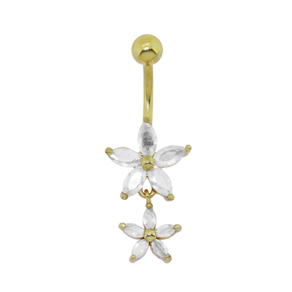 עגיל פירסינג בטבור – ציפוי זהב שני פרחים וקריסטלים לבנים