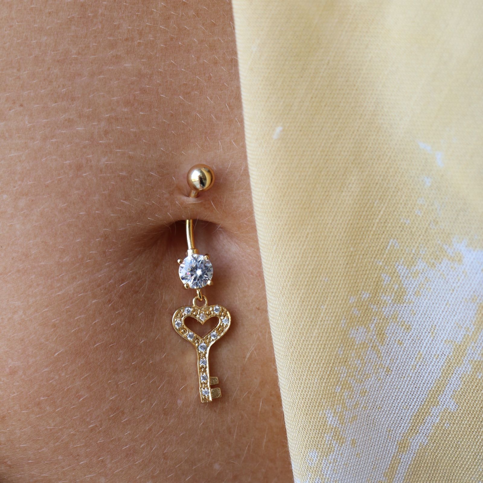 עגיל פירסינג בטבור – ציפוי זהב עיטור מפתח וקריסטלים לבנים
