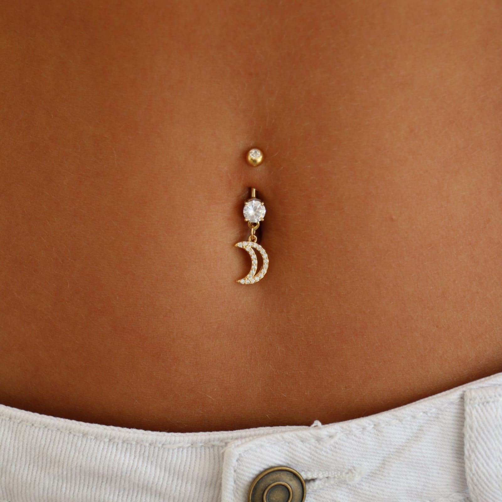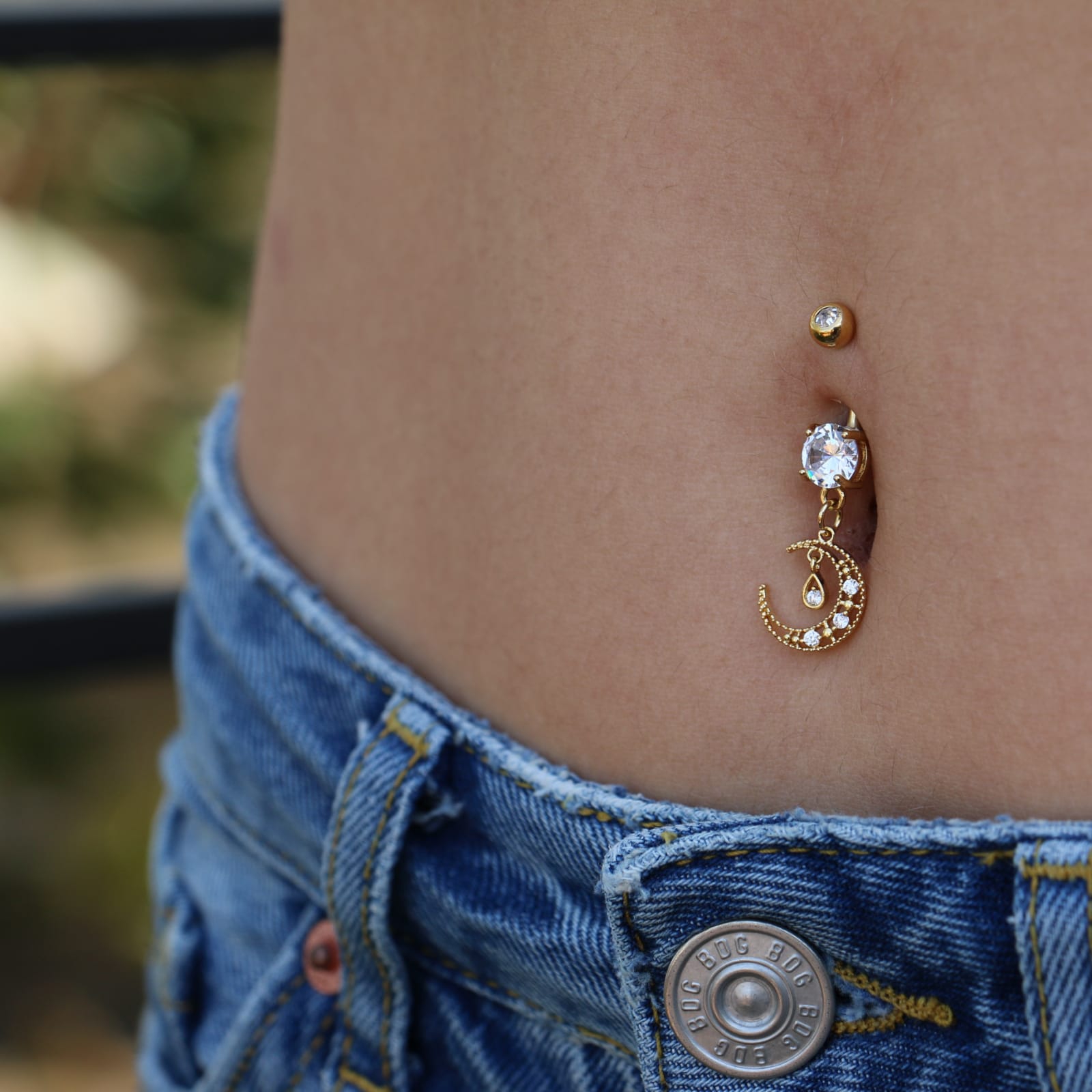 עגיל פירסינג בטבור מציפוי זהב -ירח קריסטלים לבנים זירקוניה טיפה