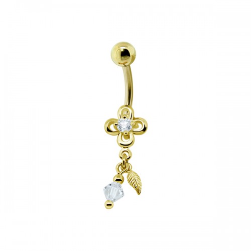 עגיל פירסינג בטבור – ציפוי זהב פרח קטן וקריסטל לבן עלה וחרוז