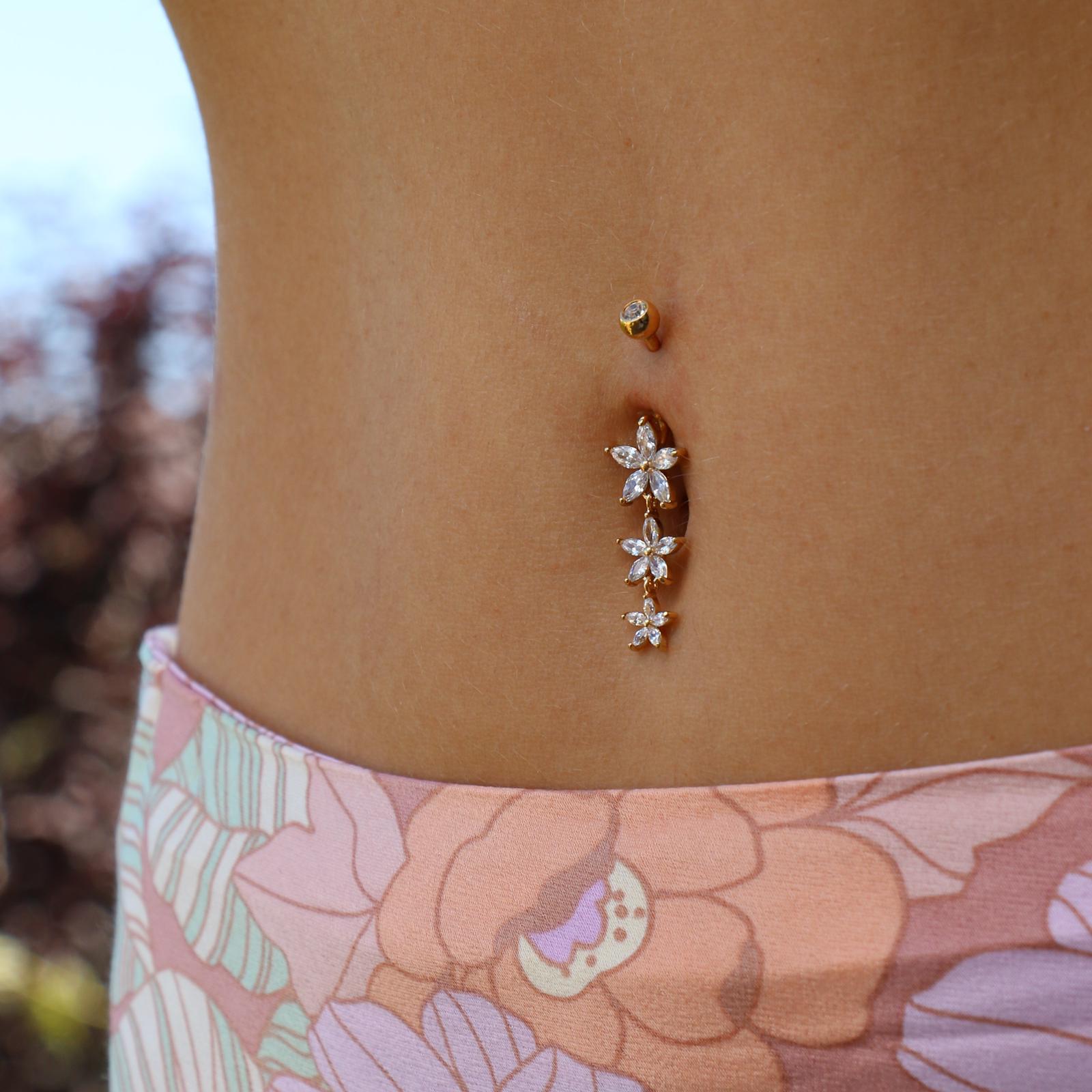 עגיל פירסינג בטבור מציפוי זהב – 3 פרחים נופלים עם קריסטלים לבנים