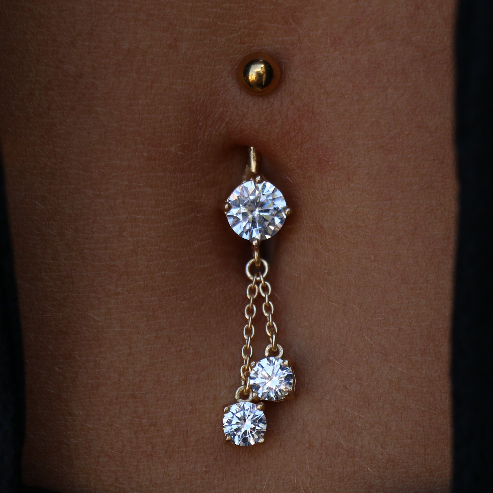עגיל פירסינג בטבור וציפוי זהב – עיגול ושרשראות וקריסטלים עגולים לבנים