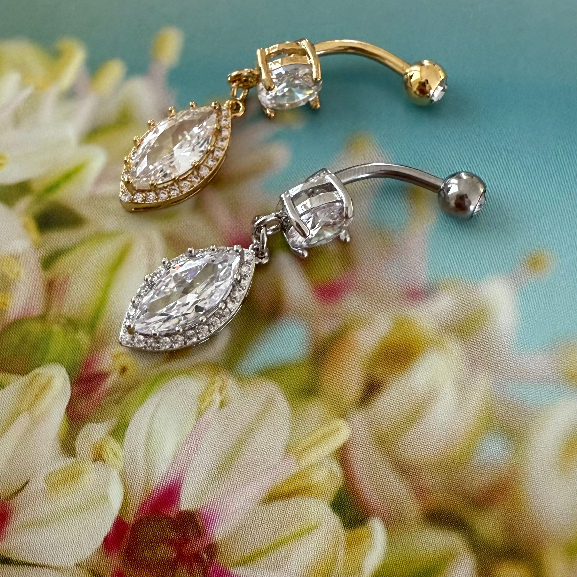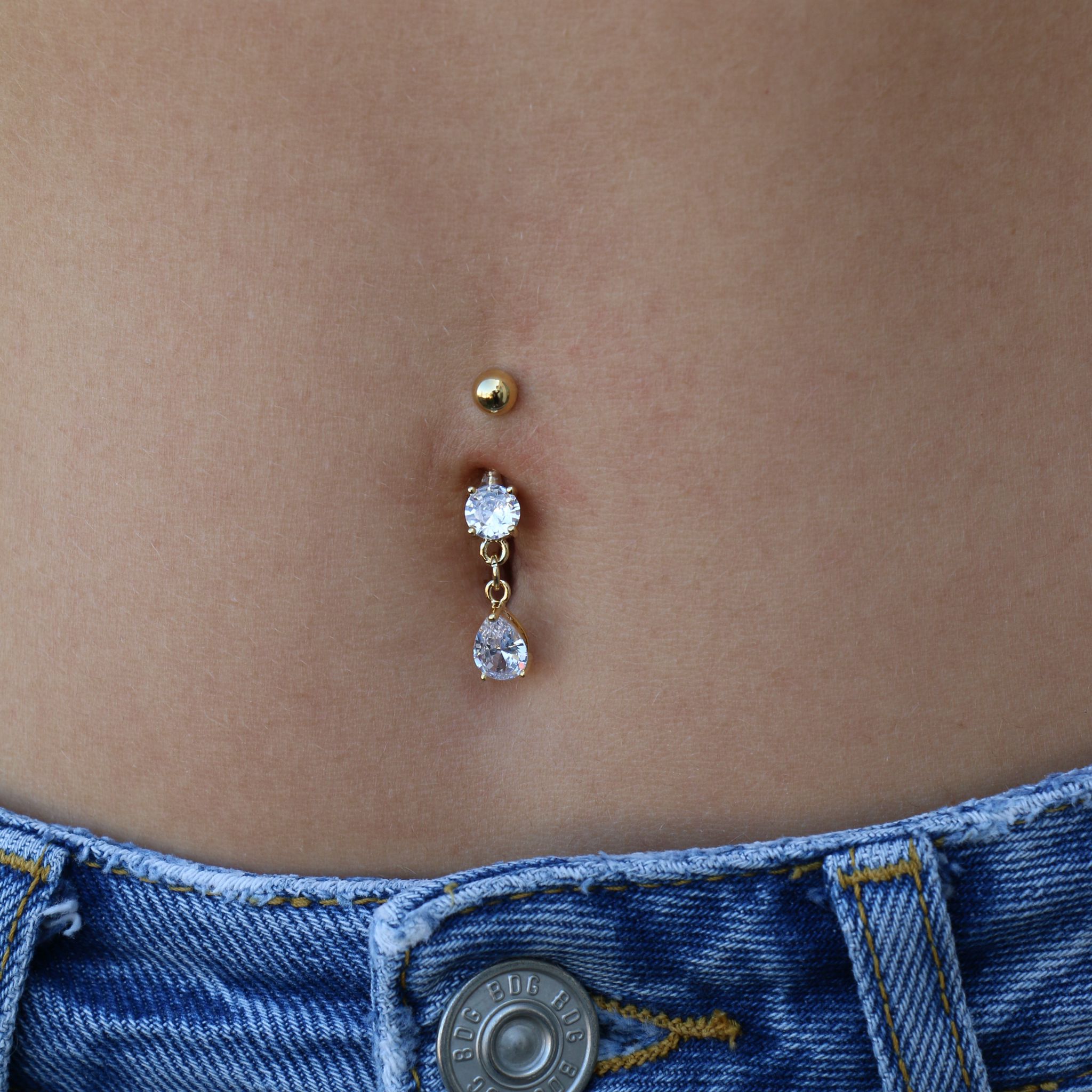 עגיל פירסינג בטבור- ציפוי זהב קריסטלים לבנים וטיפה
