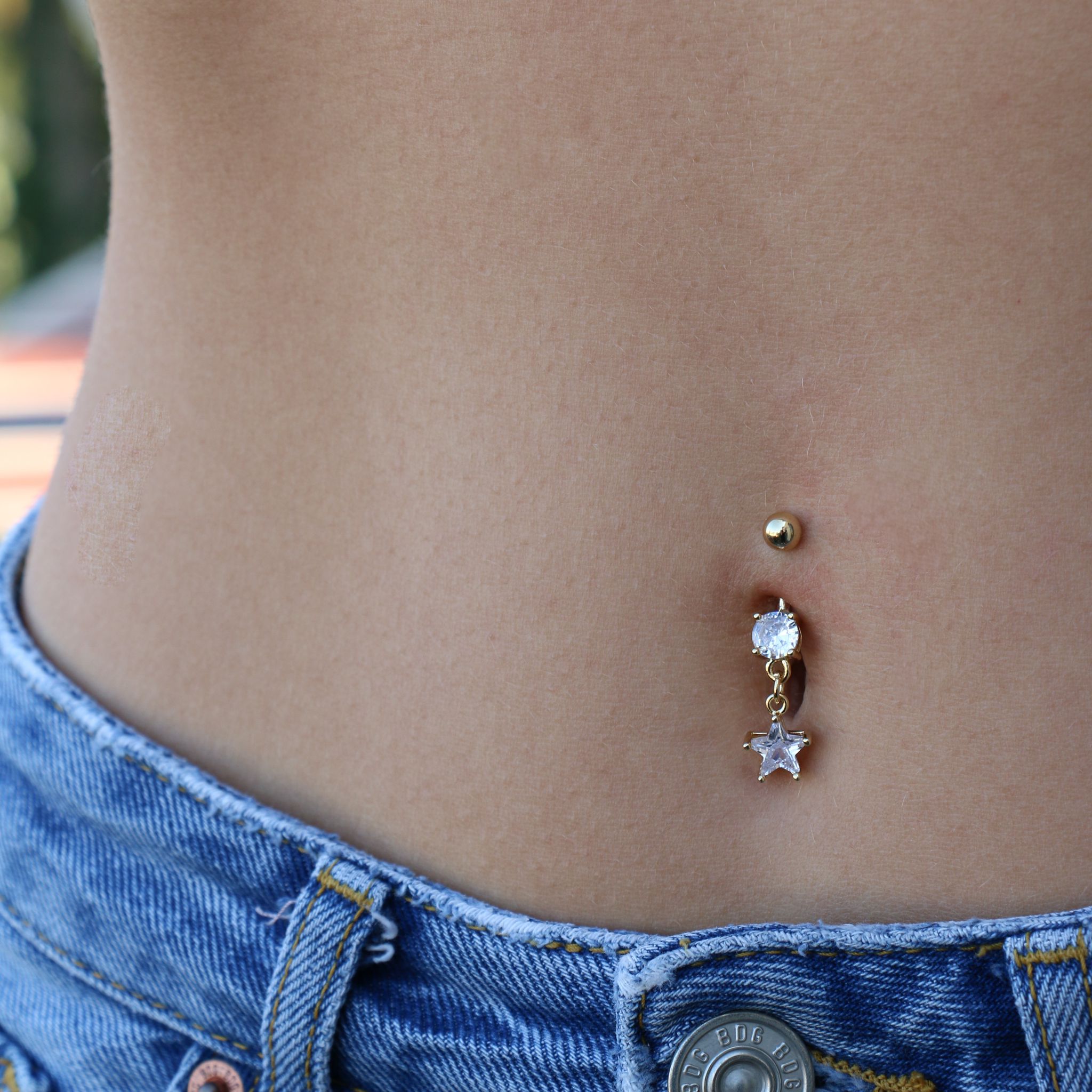 עגיל פירסינג בטבור מציפוי זהב – זירקונים עיגול וכוכב