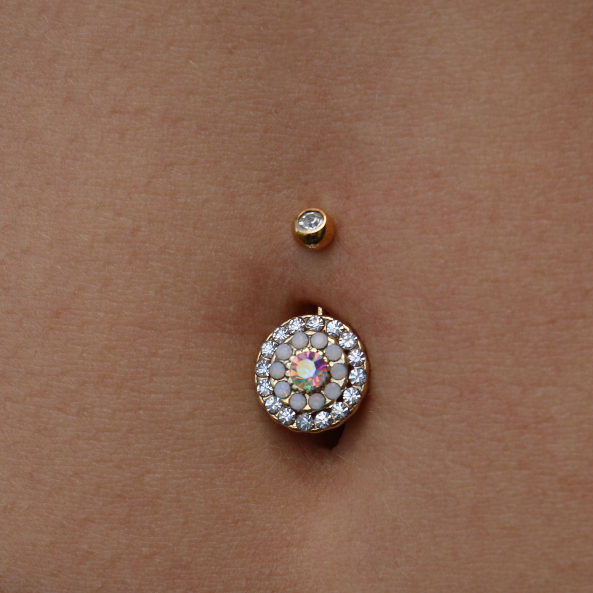 עגיל פירסינג בטבור מציפוי זהב – רוזטה קריסטלים ריינבו ולבנים