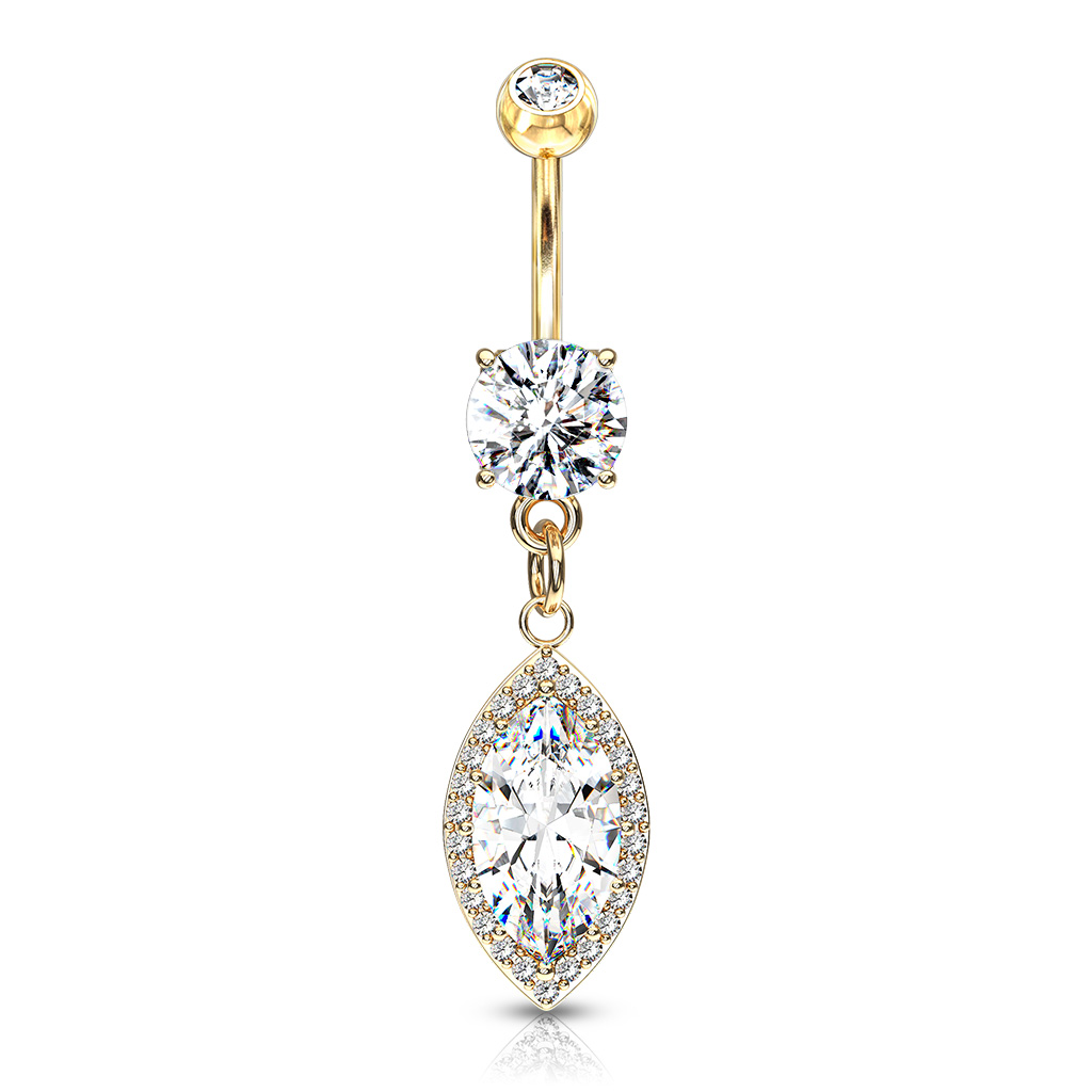 עגיל פירסינג בטבור מציפוי זהב – עיגול ומרקיז עם קריסטלים לבנים
