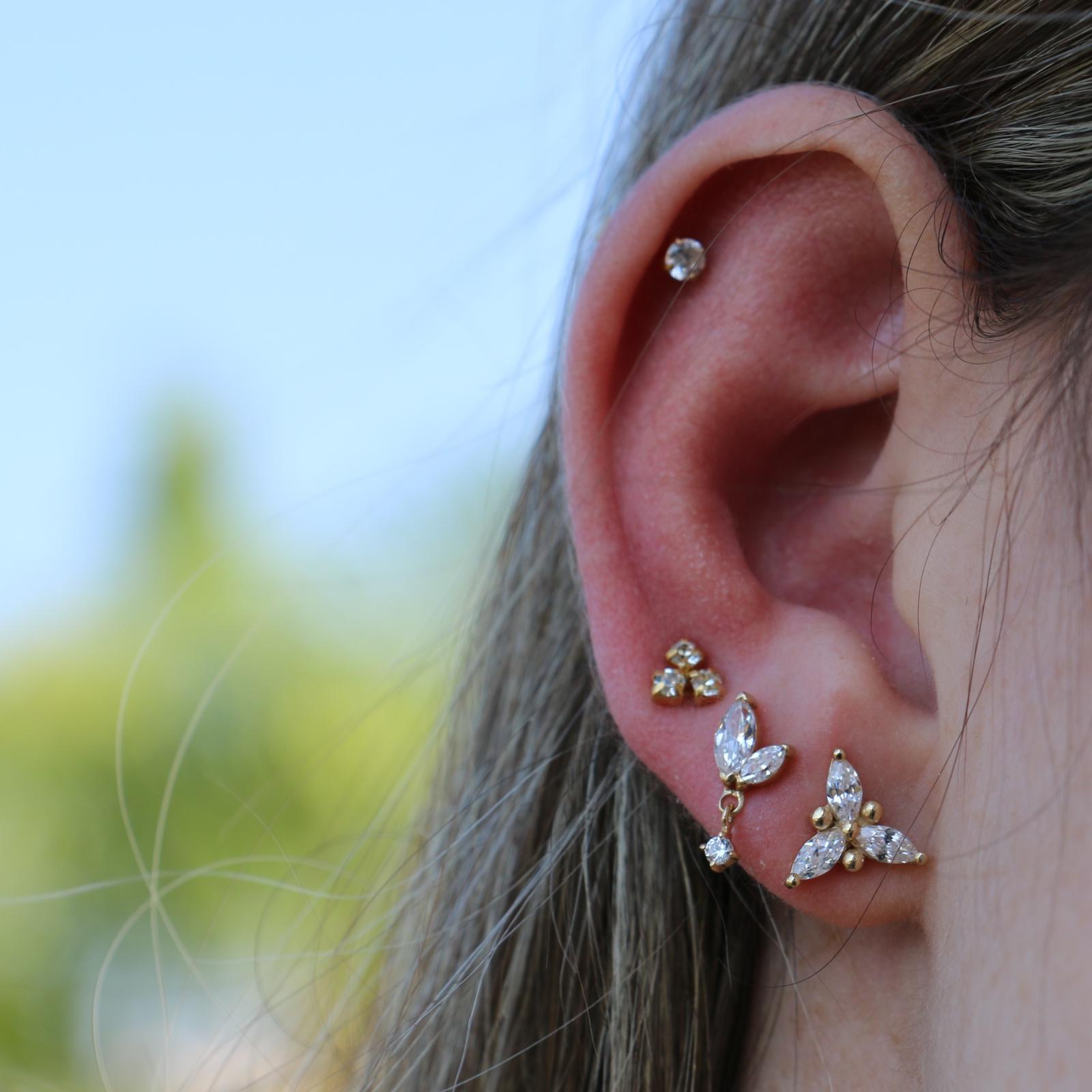 עגילים צמודים מכסף וציפוי זהב – שלושה קריסטלים לבנים