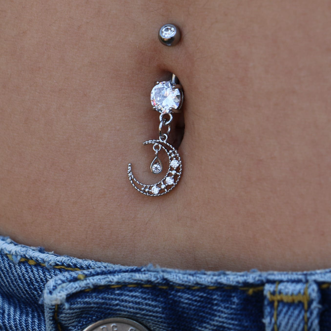 עגיל פירסינג בטבור -ירח קריסטלים לבנים זירקוניה טיפה