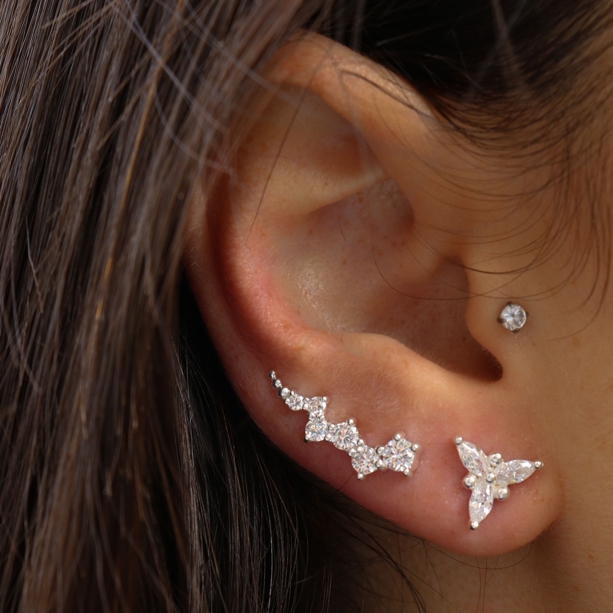 עגילים צמודים מכסף פרח עם קריסטלים לבנים