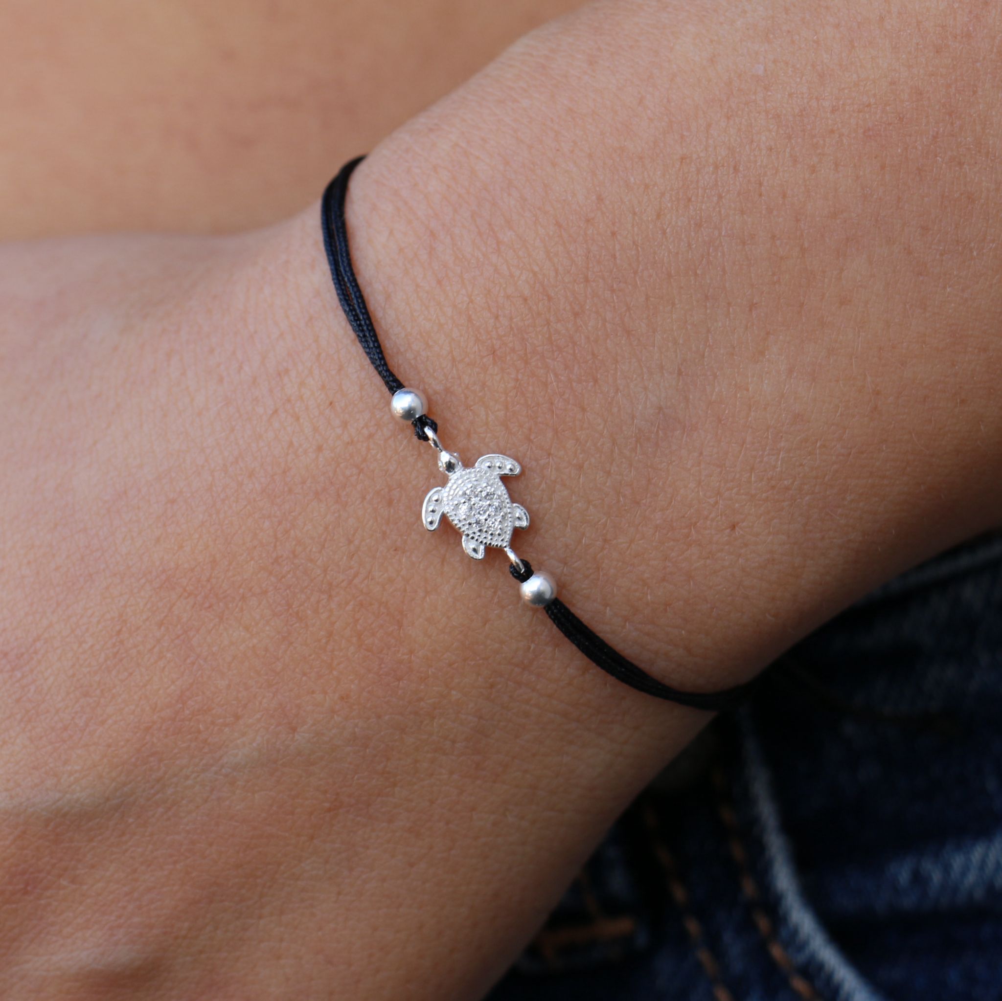 צמיד חוט שחור – תליון כסף צב עם קריסטלים לבנים