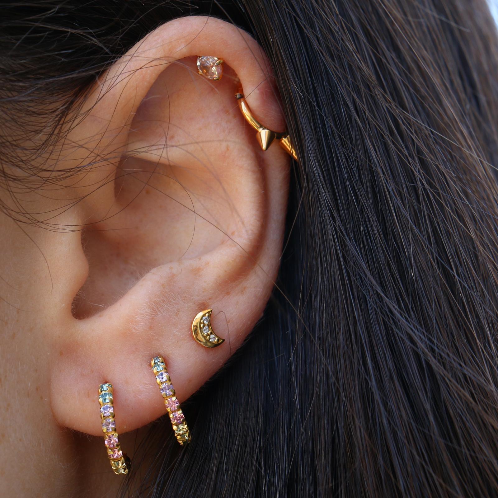 עגילים צמודים מכסף וציפוי זהב – ירח עם קריסטלים לבנים