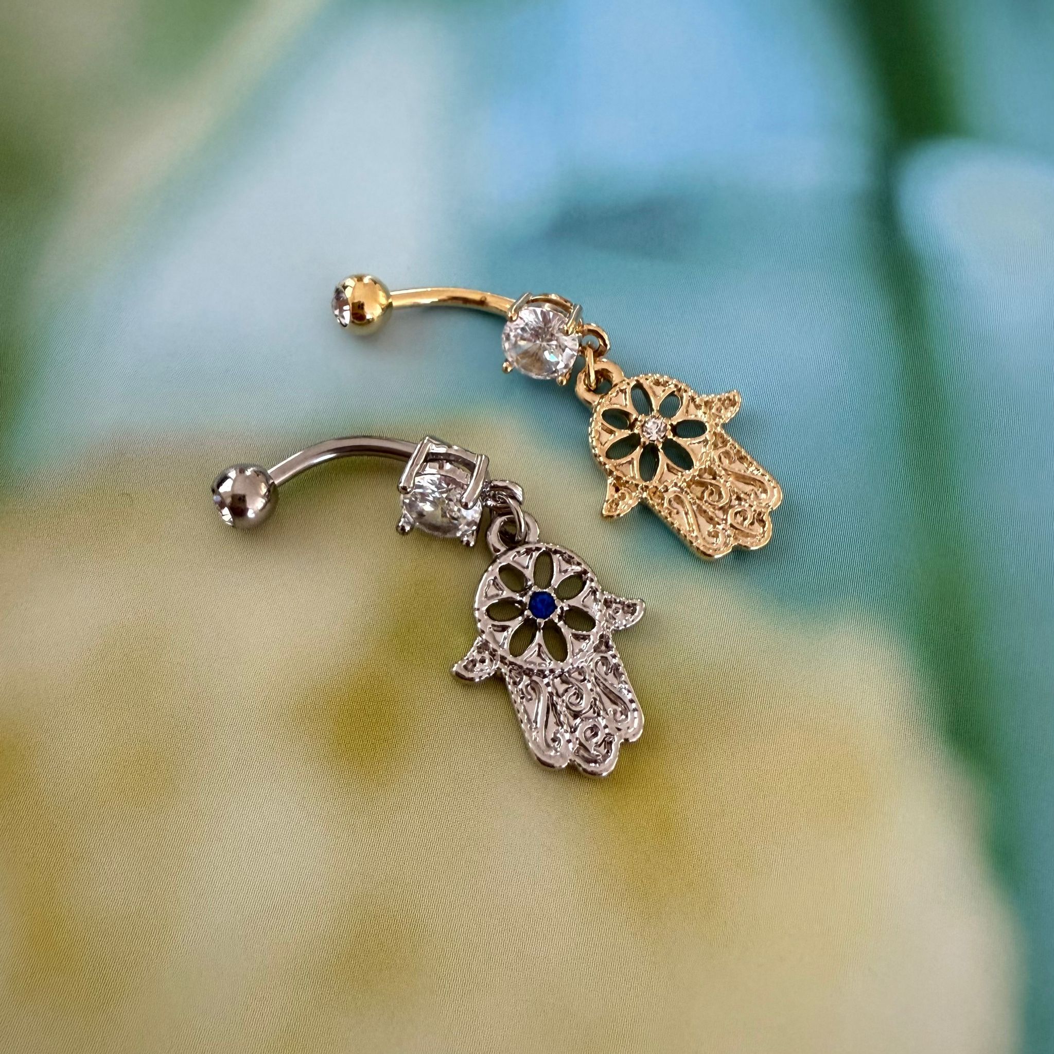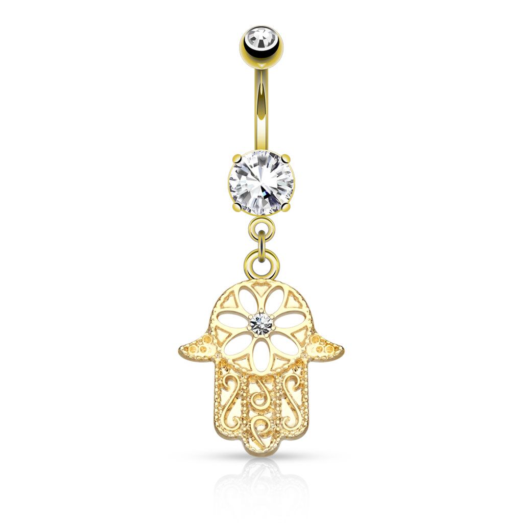 עגיל פירסינג בטבור וציפוי זהב – עיגול וחמסה עם קריסטל לבן