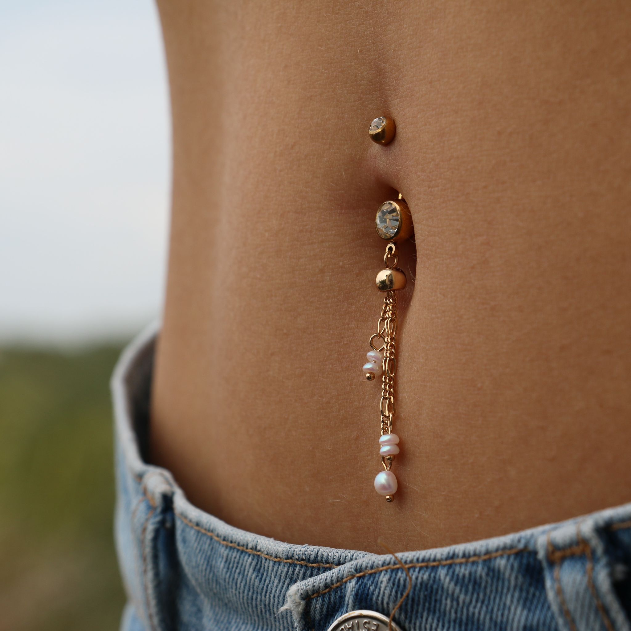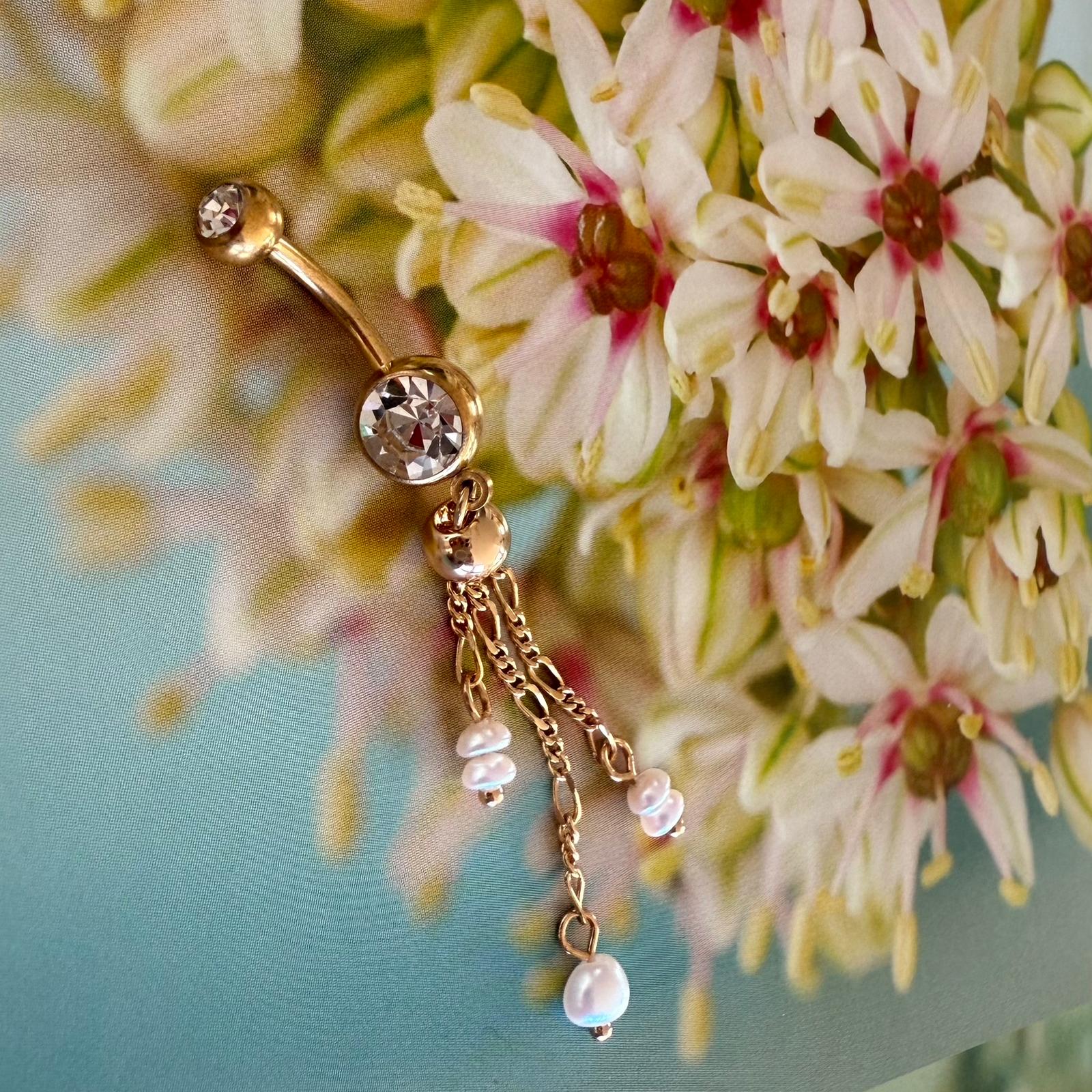 עגיל פירסינג בטבור מציפוי זהב – עיגול כדור ושלוש שרשראות עם פנינים