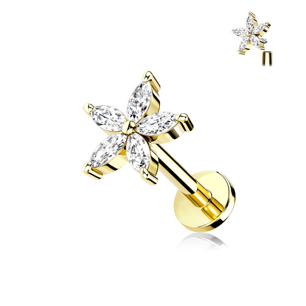 עגיל פירסינג טראגוס / הליקס / קונץ' / פלאט – מציפוי זהב מרגנית עם קריסטלים לבנים