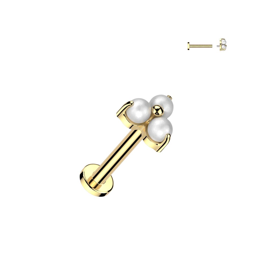 עגיל הליקס / טראגוס / קונץ' / פלאט מטיטניום וציפוי זהב – פרח 3 פנינים לבנים בהברגה