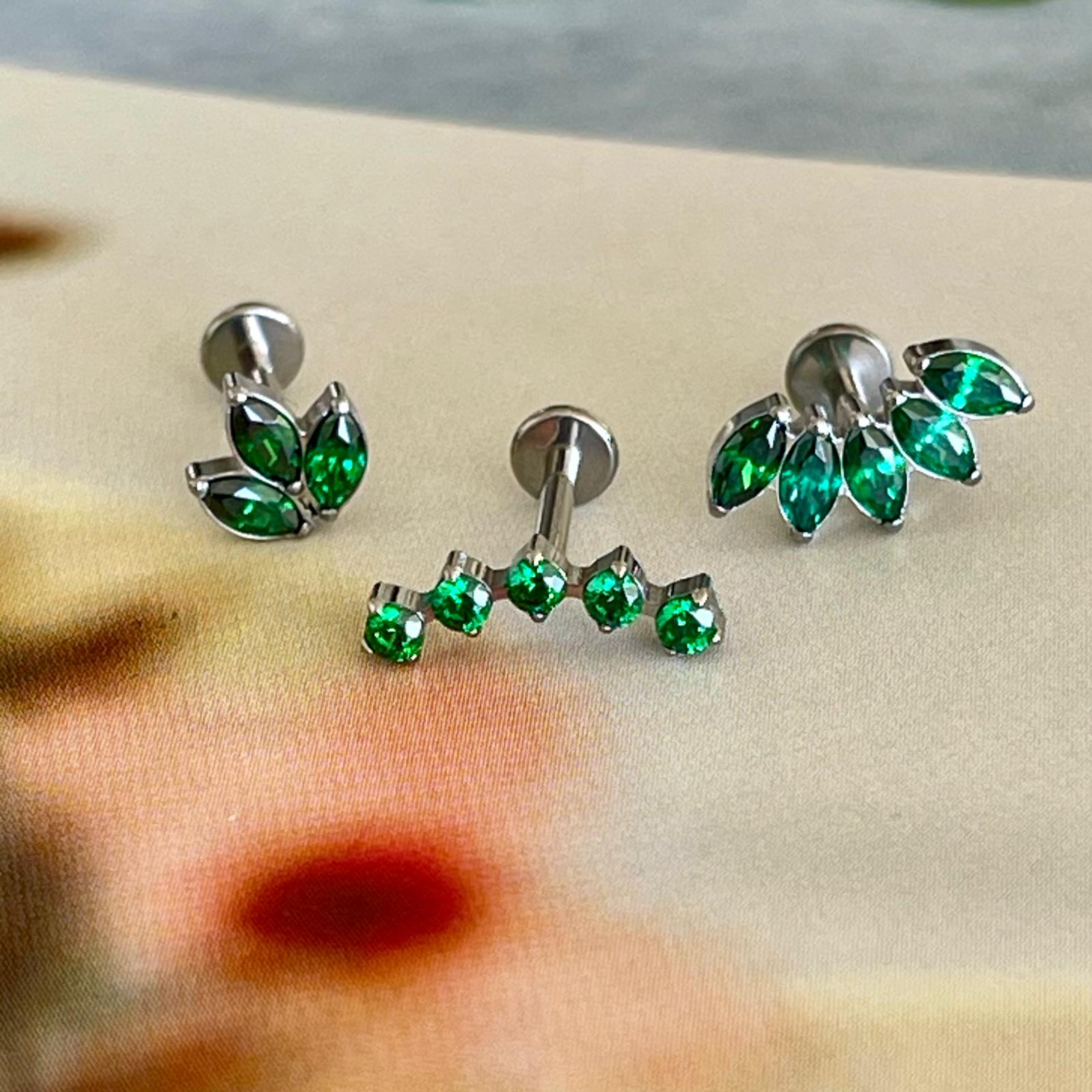 עגיל הליקס / טראגוס / קונץ' / פלאט מטיטניום – לוטוס של קריסטלים מרקיזים ירוקים אמרלד בהברגה