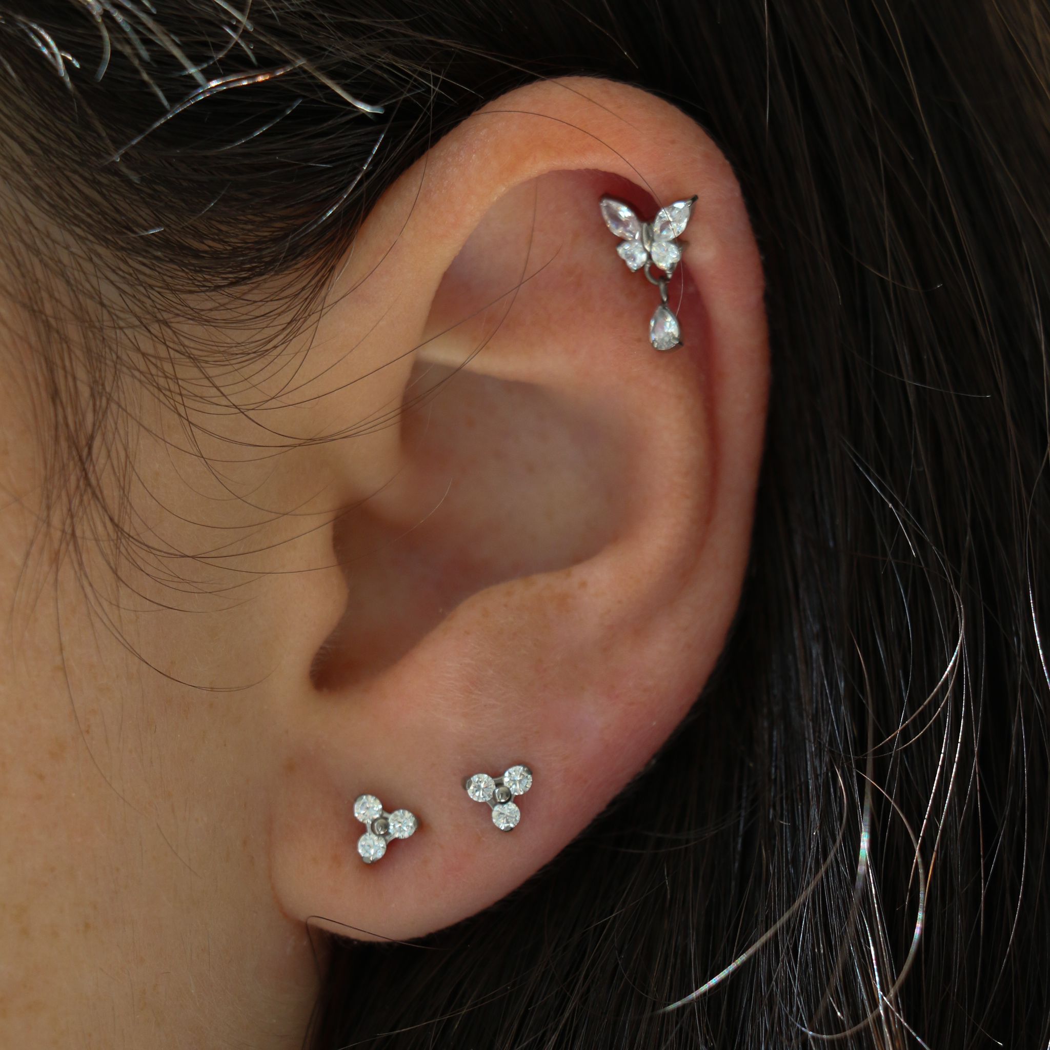 עגיל הליקס / טראגוס / קונץ' / פלאט מטיטניום – פרפר וטיפה קריסטלים לבנים בהברגה