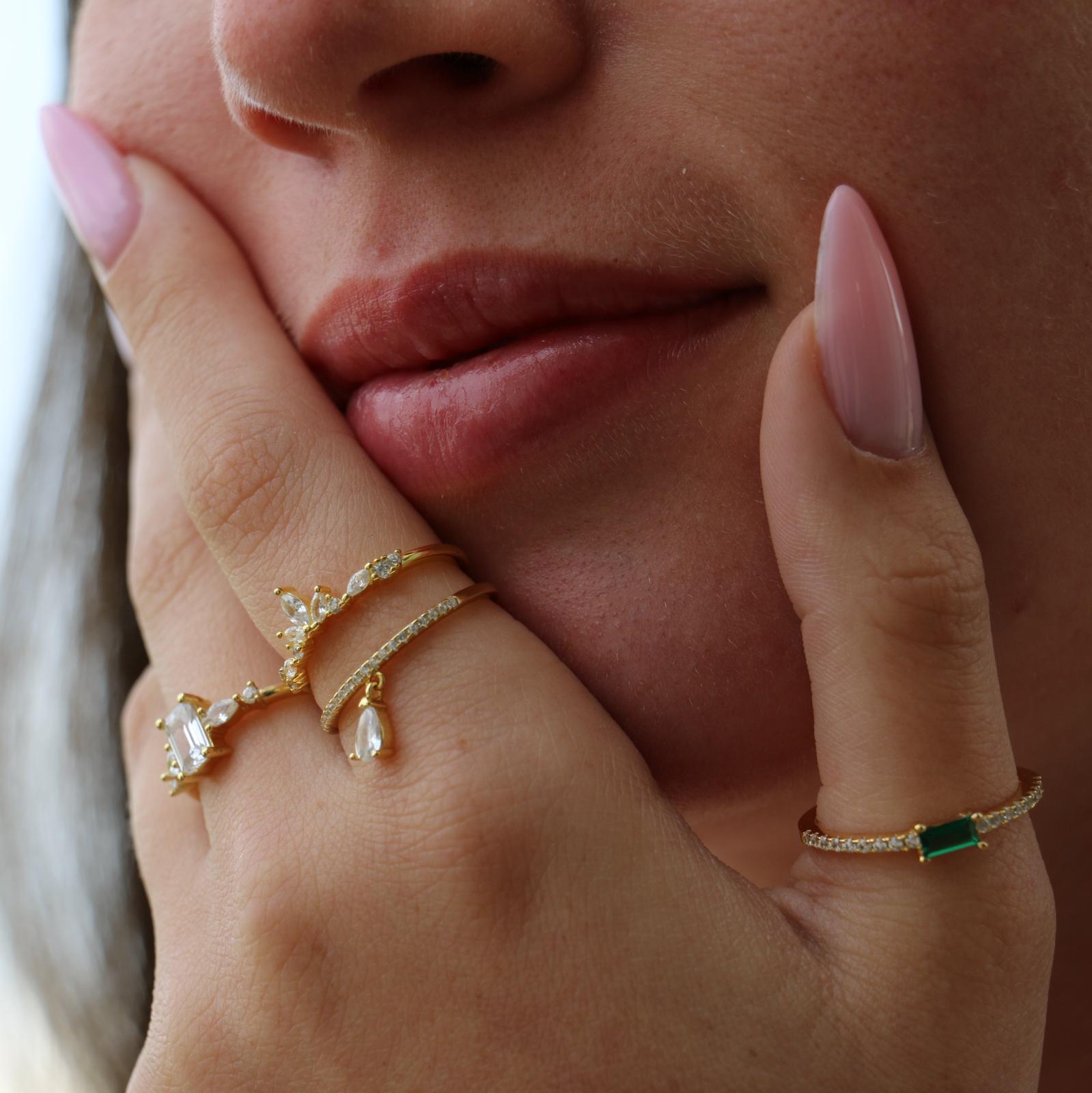 טבעת מכסף וציפוי זהב – זירקון טיפה נתלה וקריסטלים לבנים