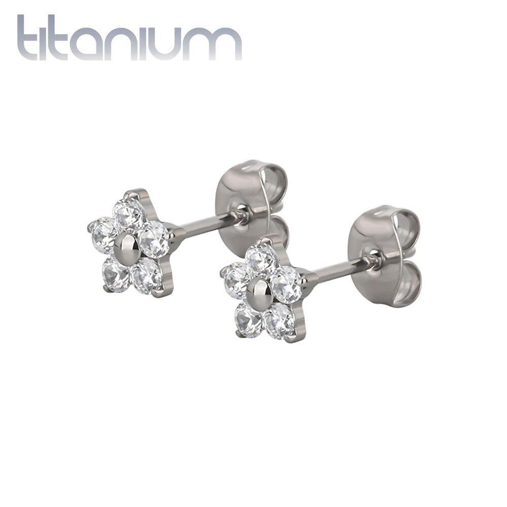עגילי סטד מטיטניום – פרח עם קריסטלים לבנים
