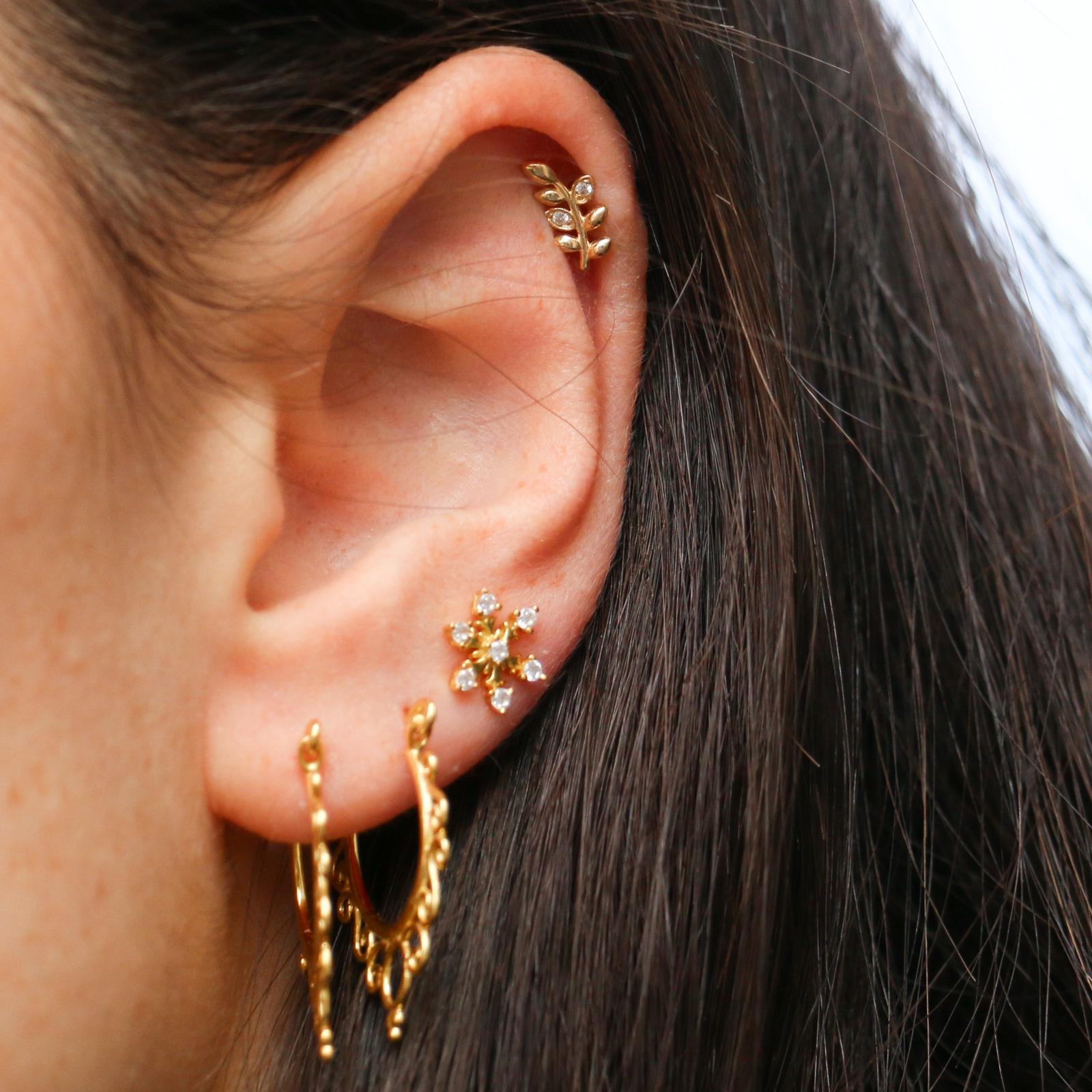 עגילי סטד מכסף וציפוי זהב פתית שלג וקריסטלים לבנים
