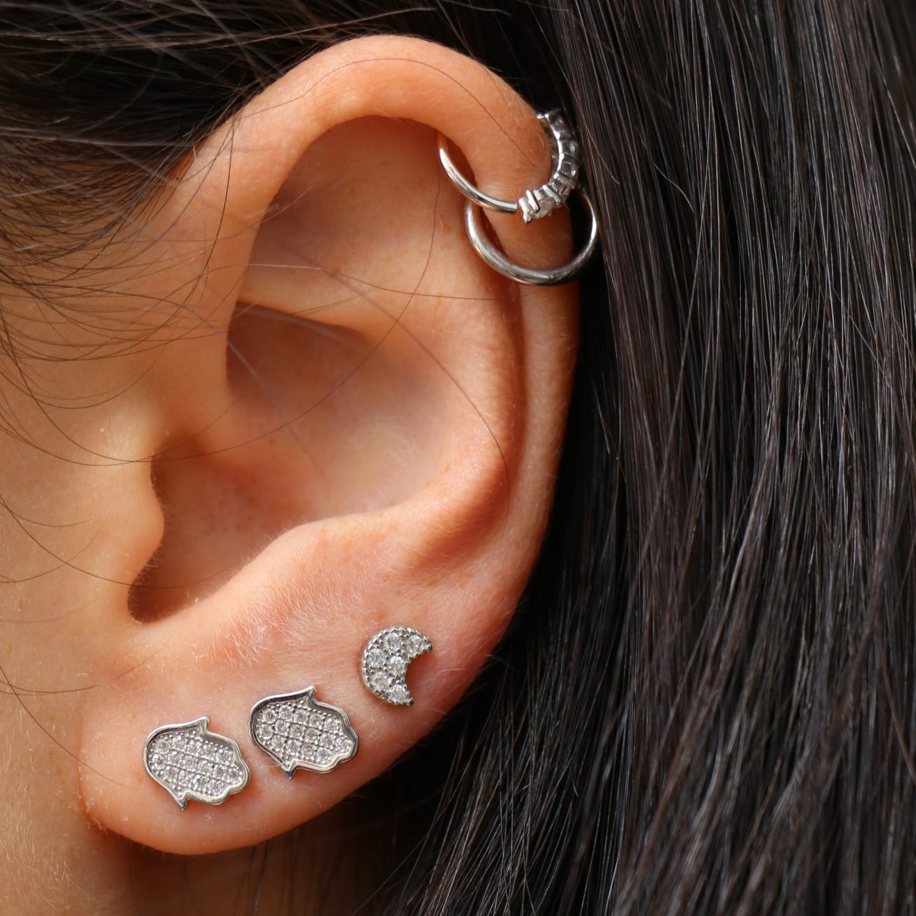 עגילי סטד מכסף וציפוי רודיום חמסה וקריסטלים לבנים