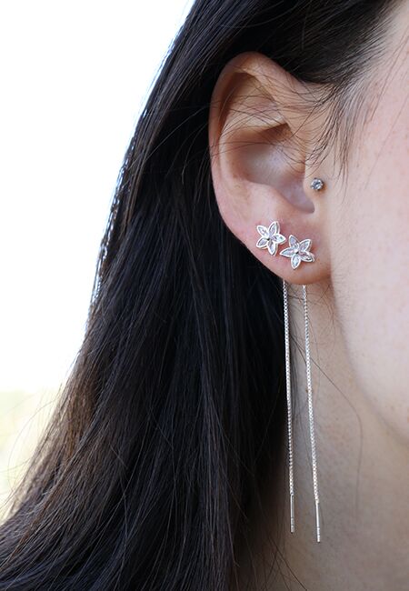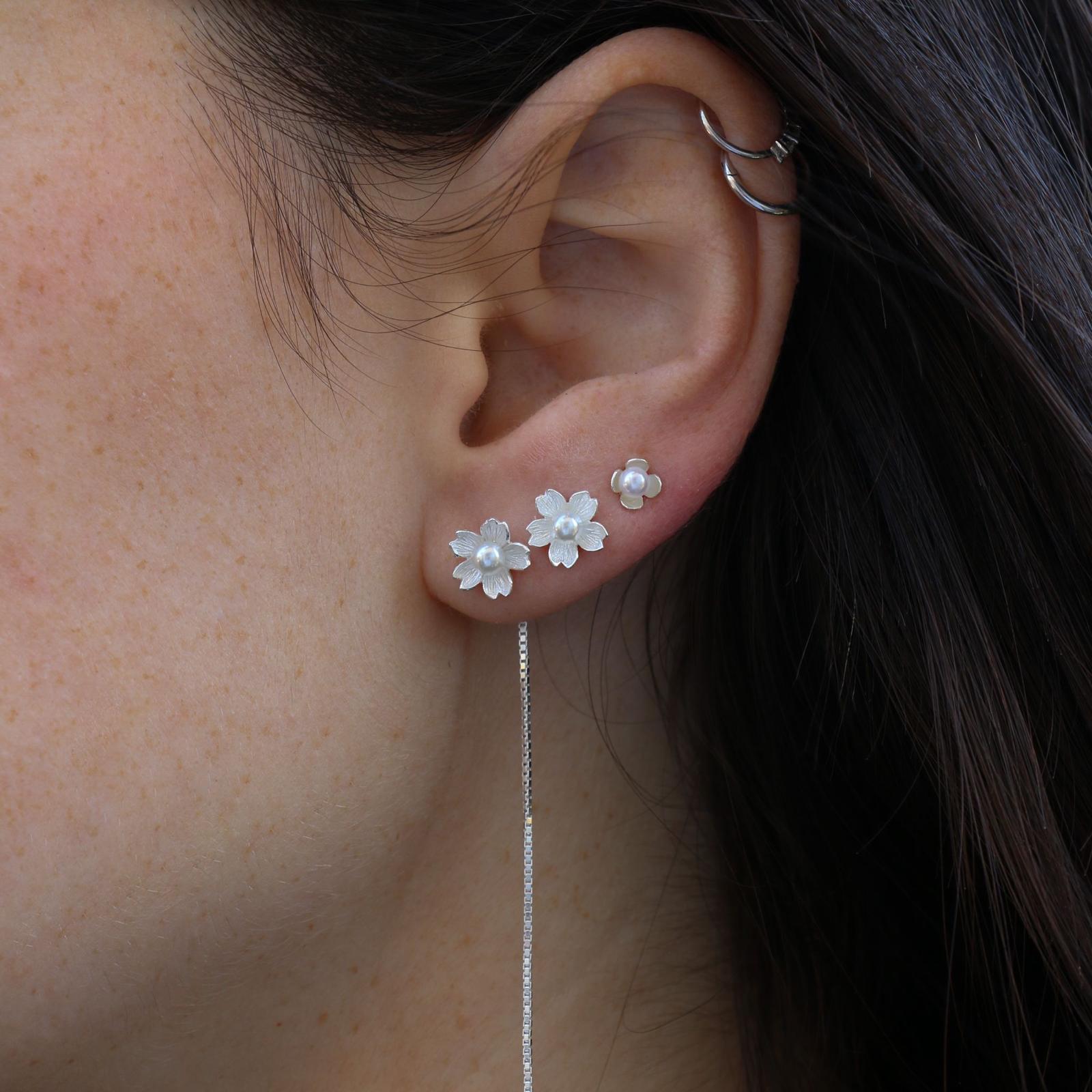 זוג עגילי שרשרת מכסף – פרח ופנינה לבנה