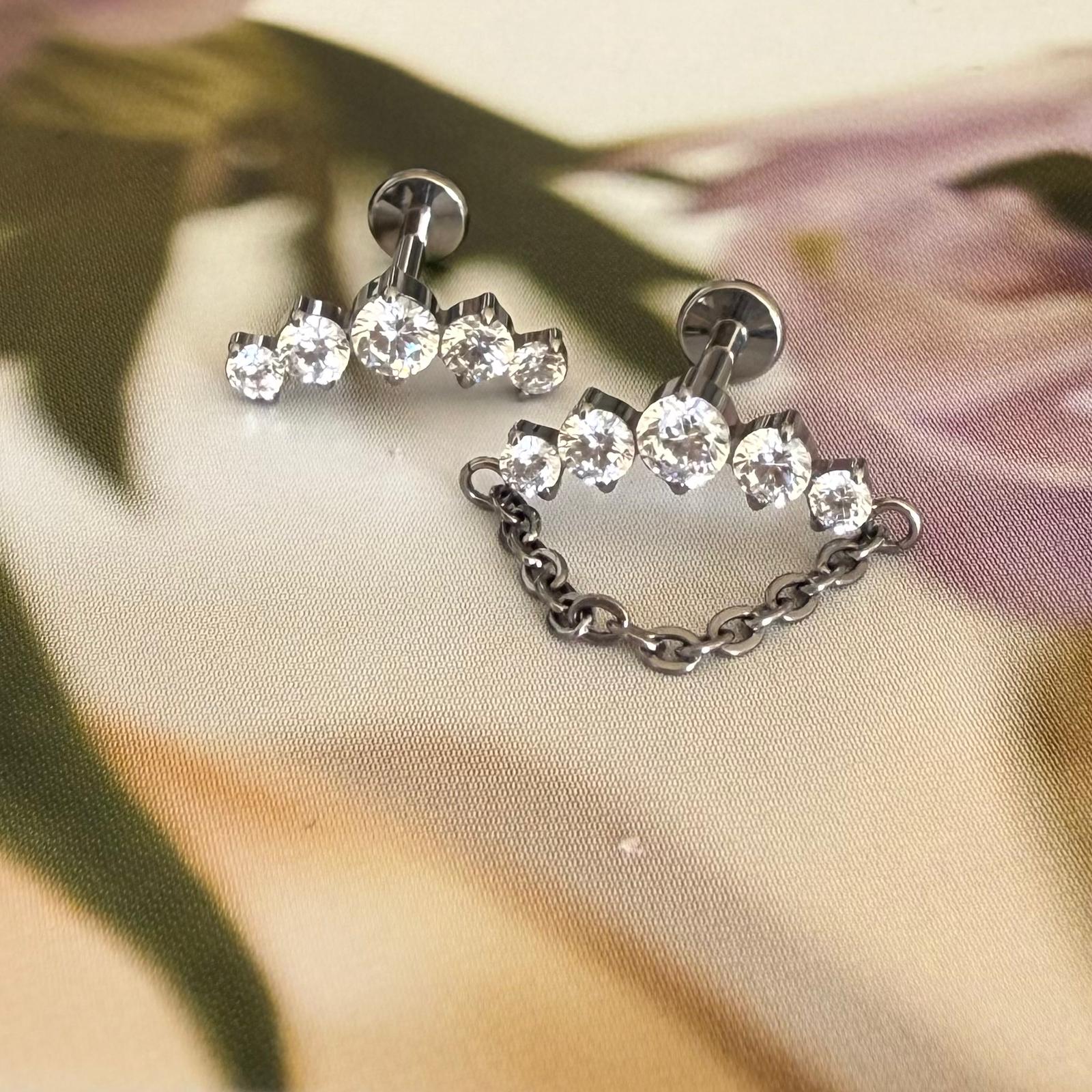 עגיל הליקס / קונץ' / פלאט מטיטניום – קשת של 5 קריסטלים עגולים לבנים ושרשרת