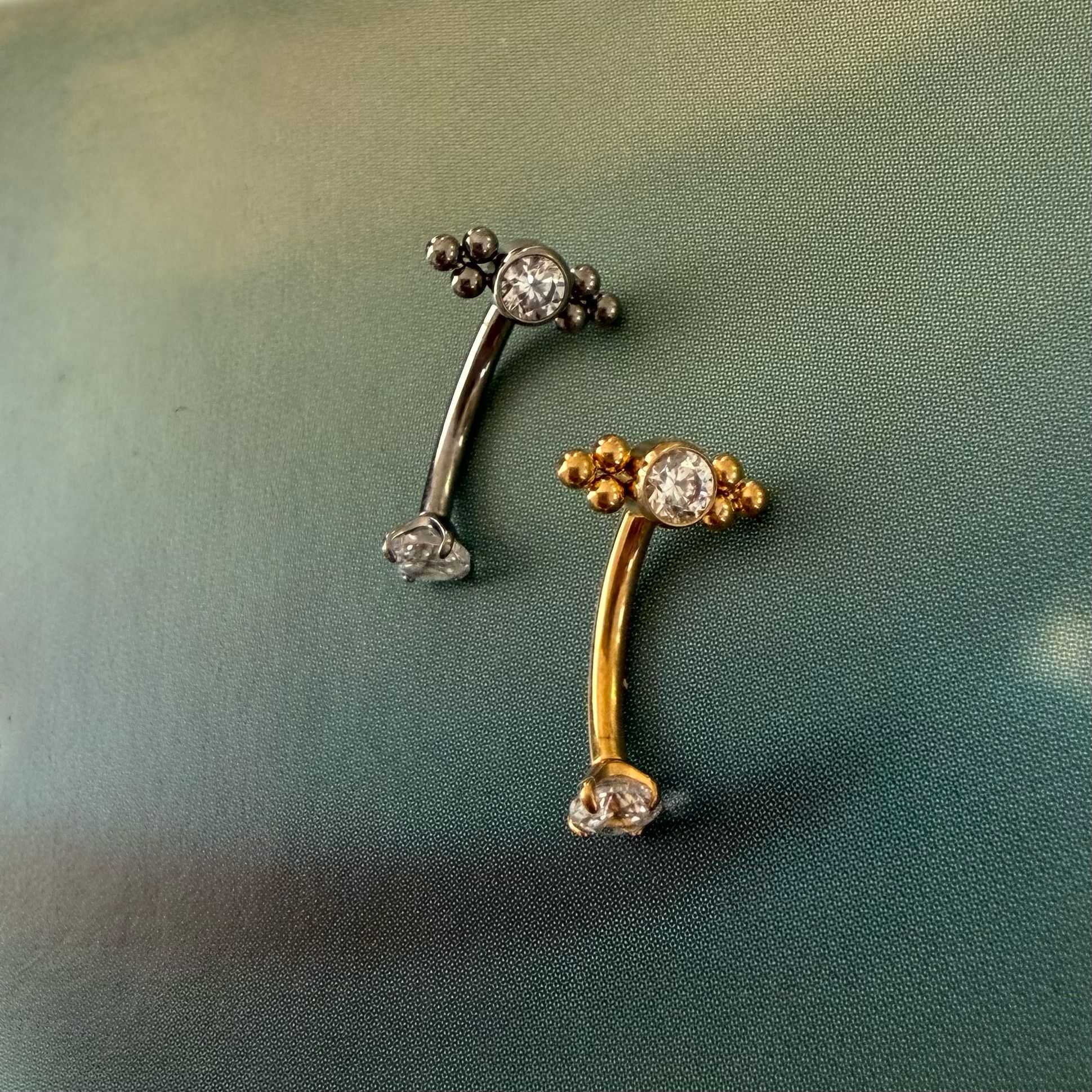 עגיל פירסינג בגבה / רוק מטיטניום וציפוי זהב – קריסטל עגול לבן ונקודות