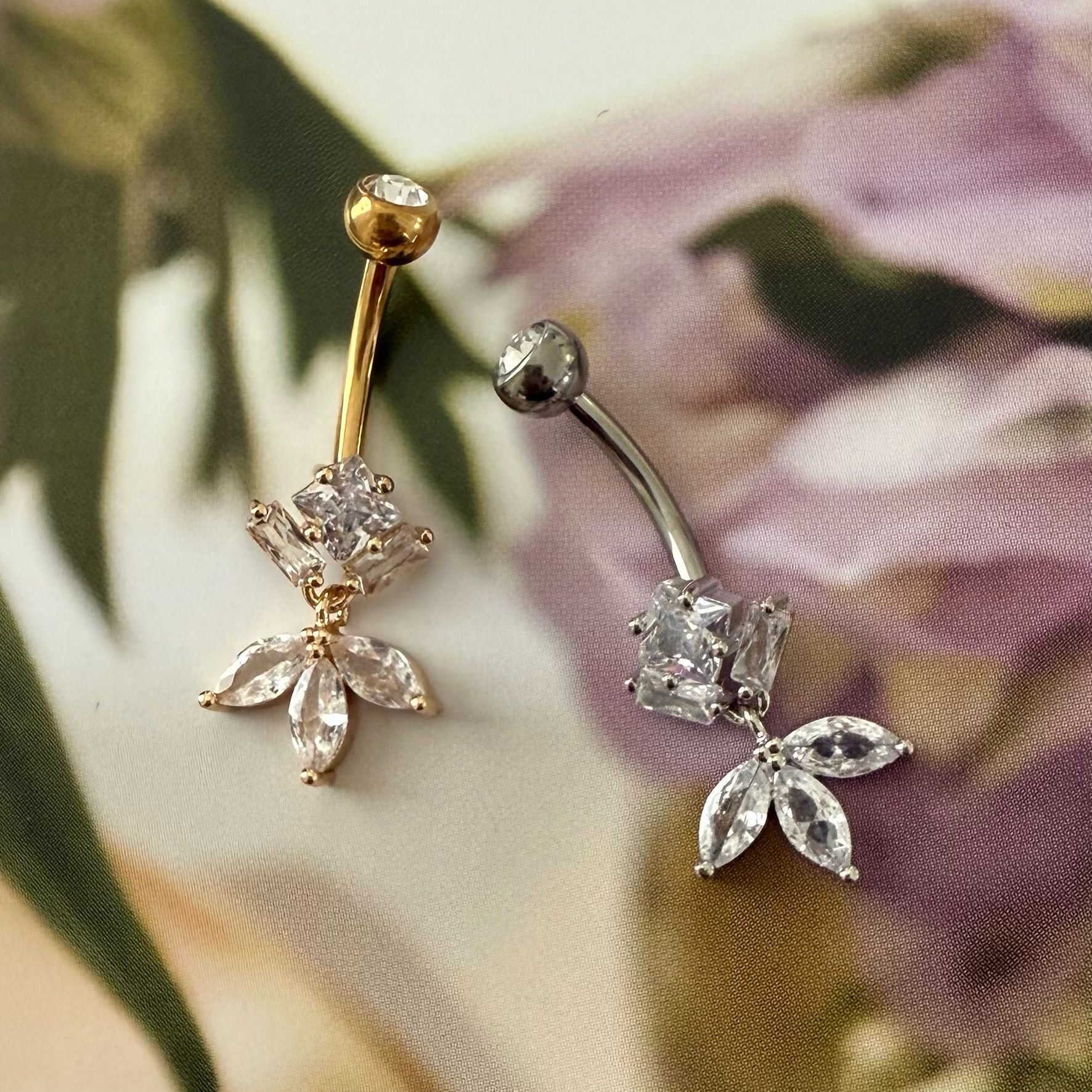 עגיל פירסינג בטבור וציפוי זהב – ריבוע ובאגטים לוטוס נתלה של קריסטלים לבנים