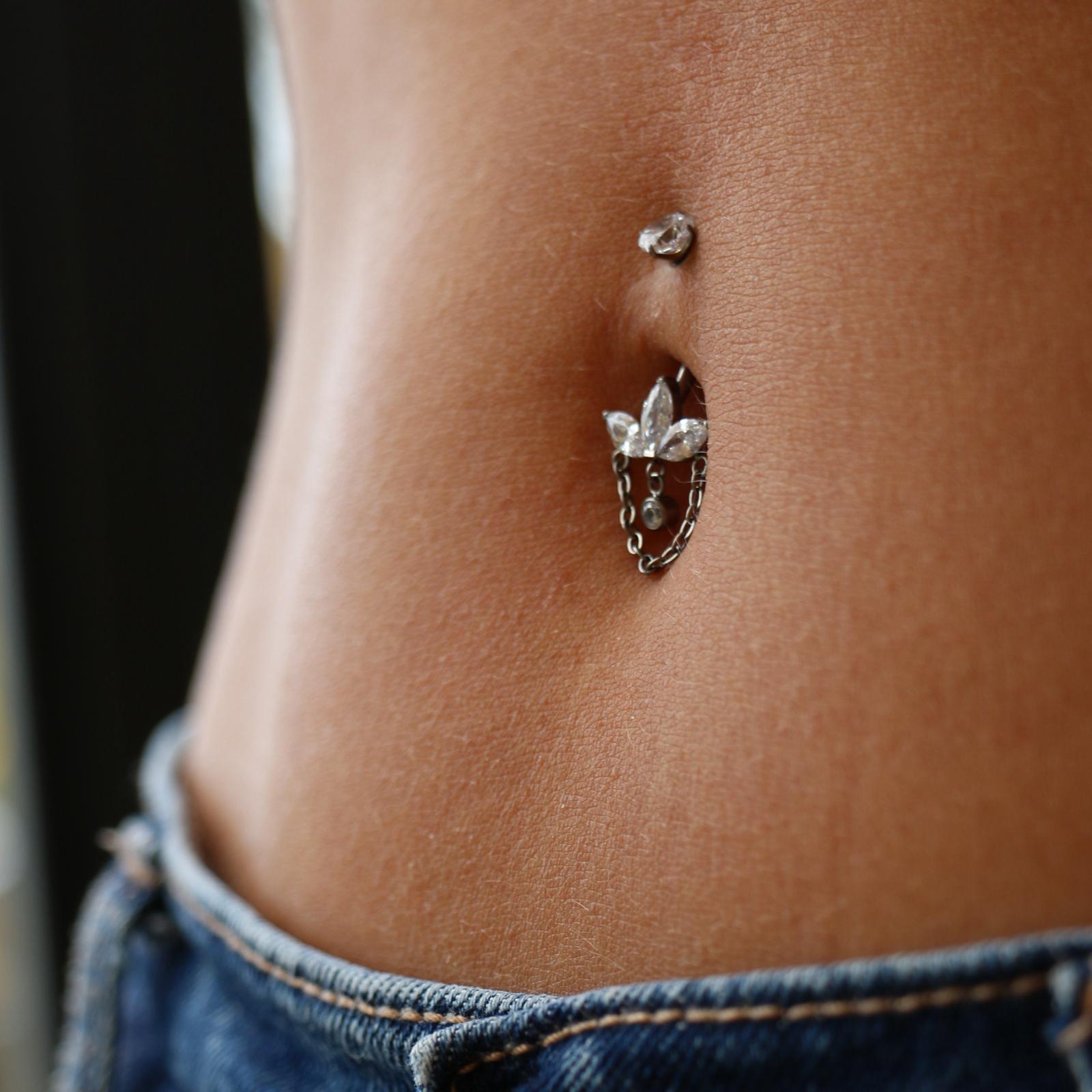 עגיל פירסינג בטבור מטיטניום – לוטוס מרקיזים לבנים עיגול נתלה ושרשרת