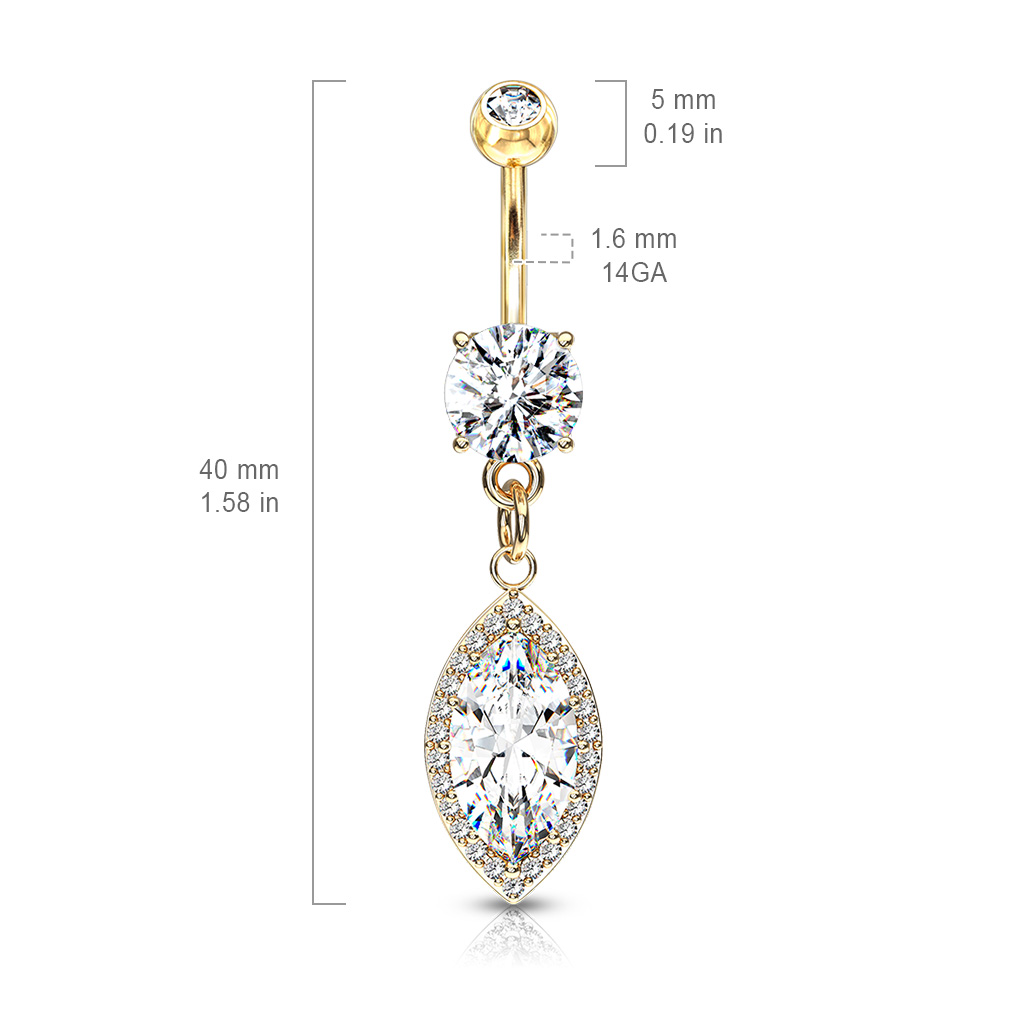 עגיל פירסינג בטבור מציפוי זהב – עיגול ומרקיז עם קריסטלים לבנים