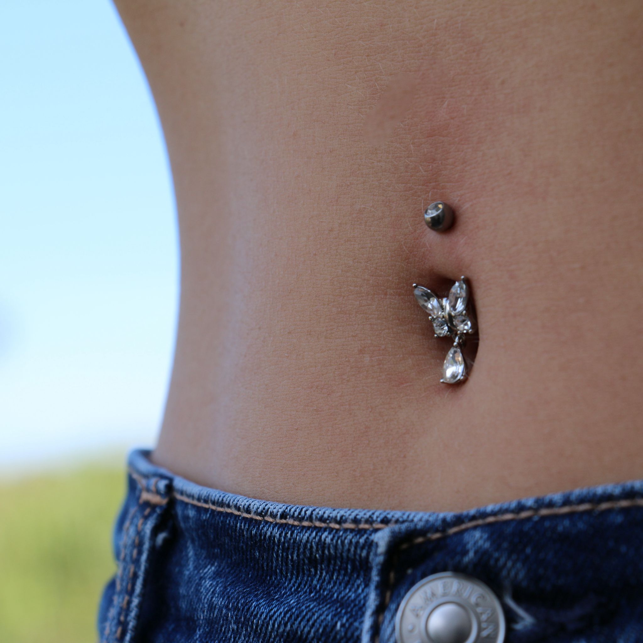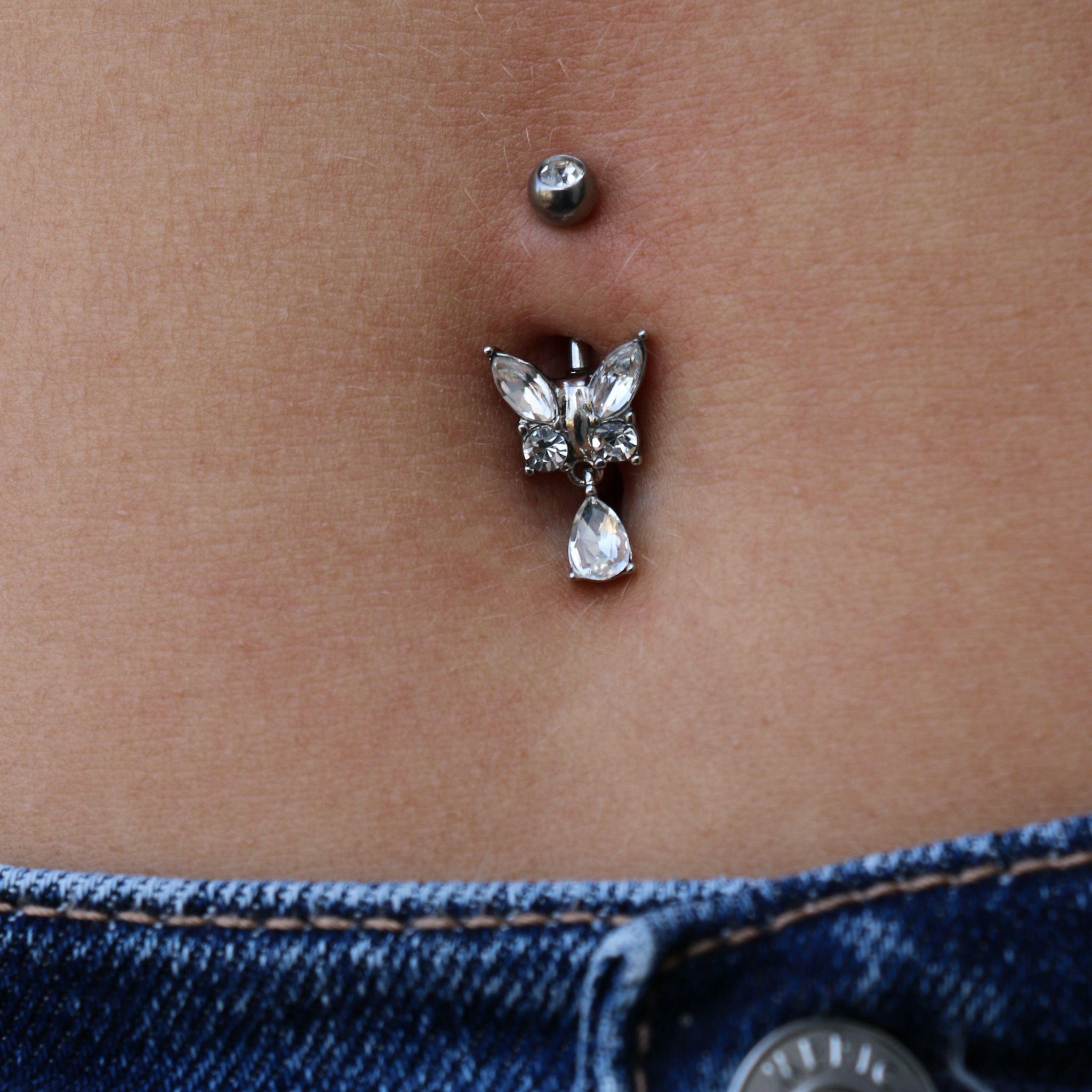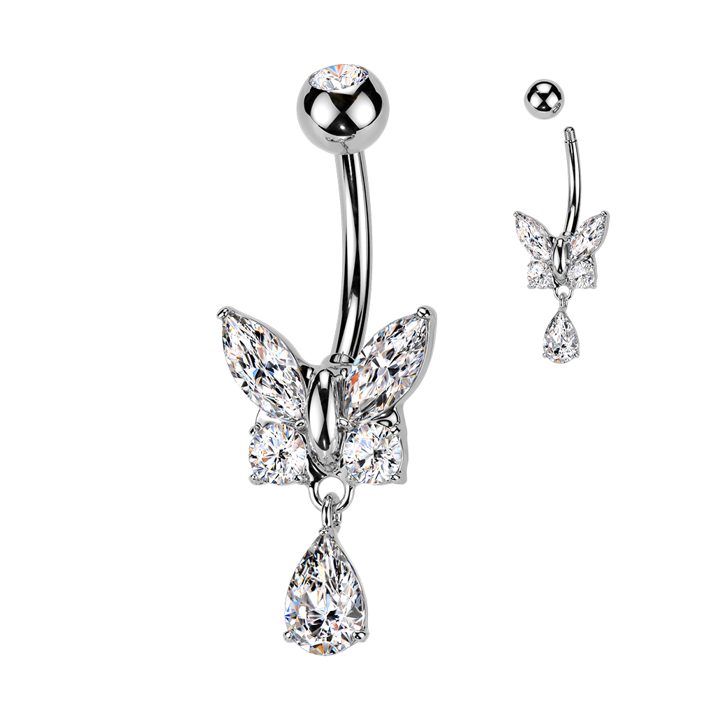 עגיל פירסינג בטבור – פרפר וטיפה עם קריסטלים לבנים