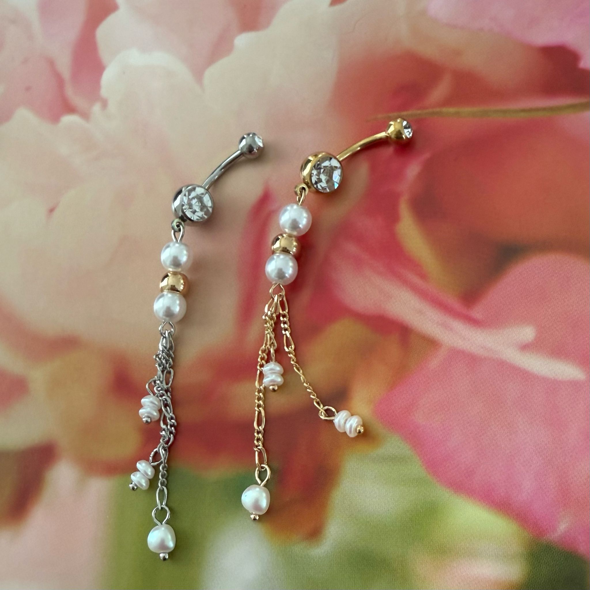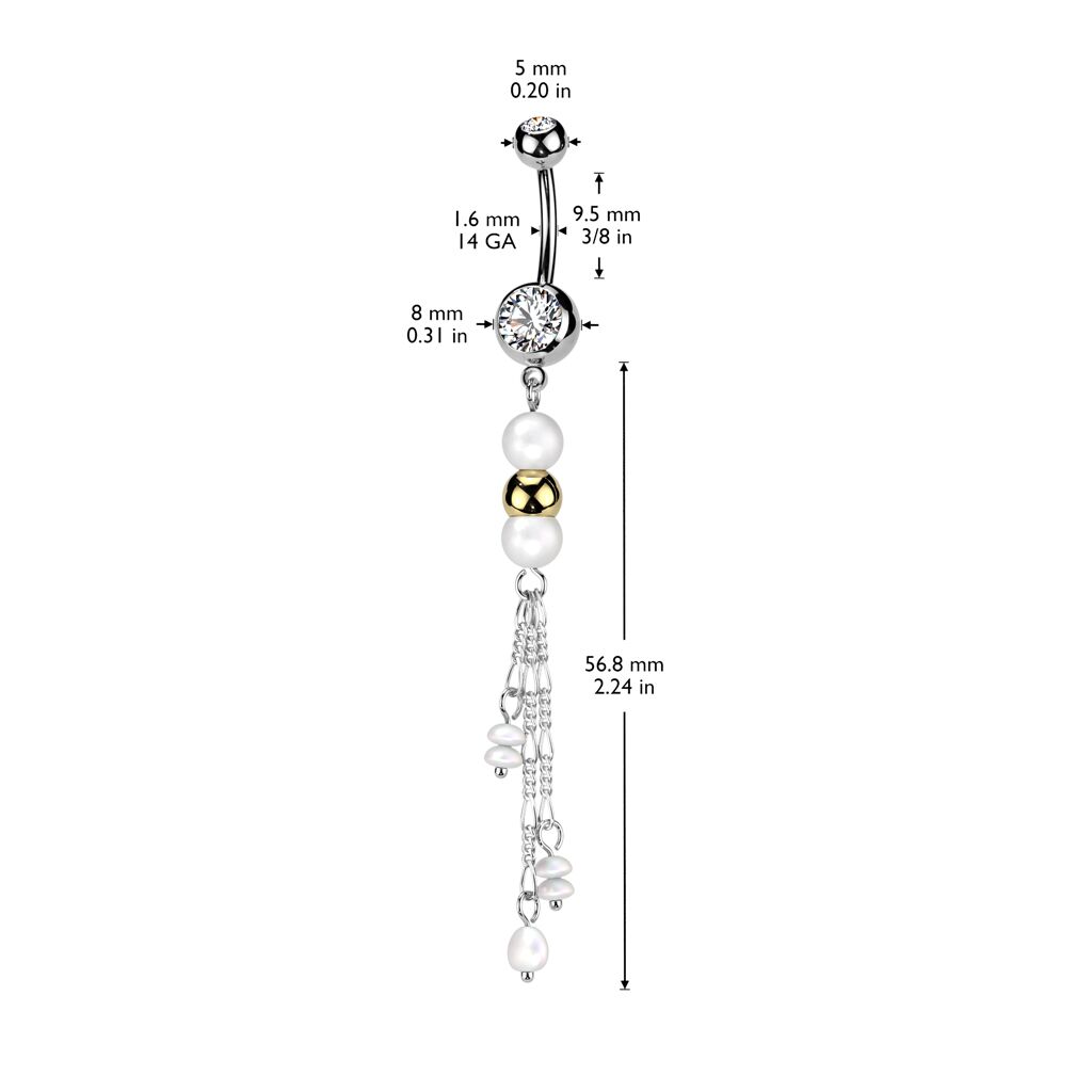 עגיל פירסינג בטבור – שתי פנינים כדור זהוב ושלוש שרשראות עם פנינים