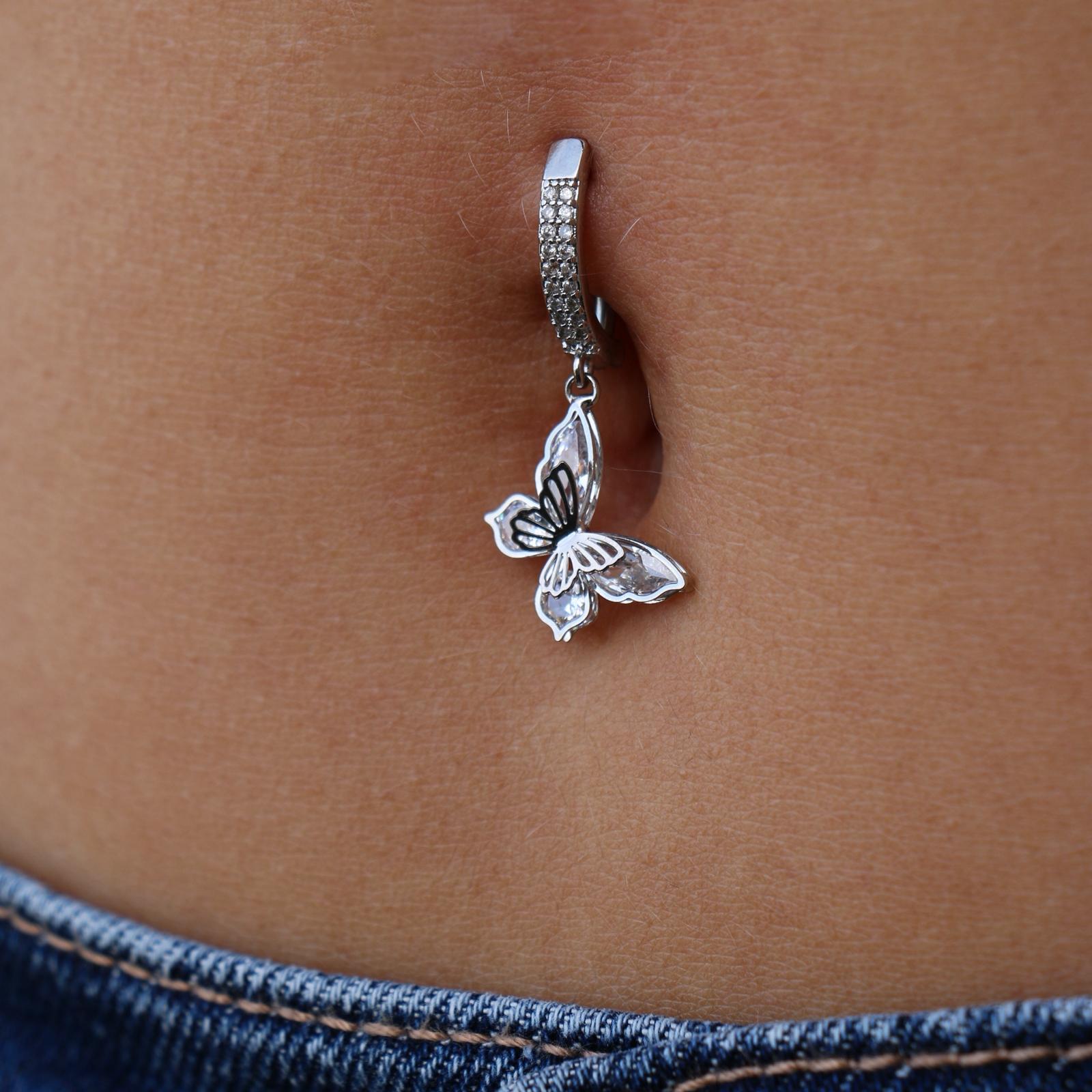 עגיל פירסינג קליקר בטבור וציפוי זהב – פרפר עם קריסטלים לבנים