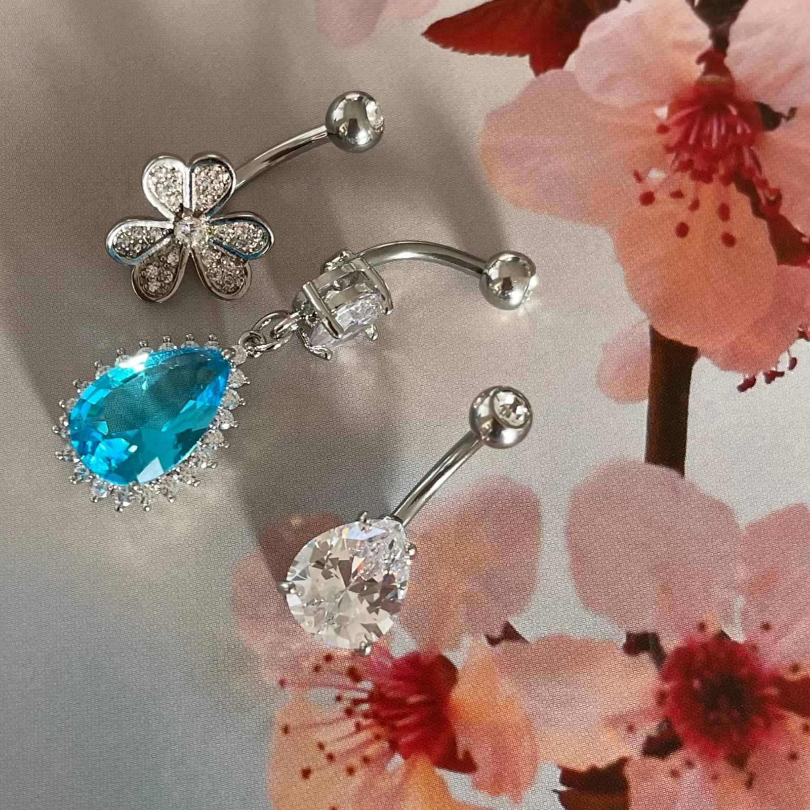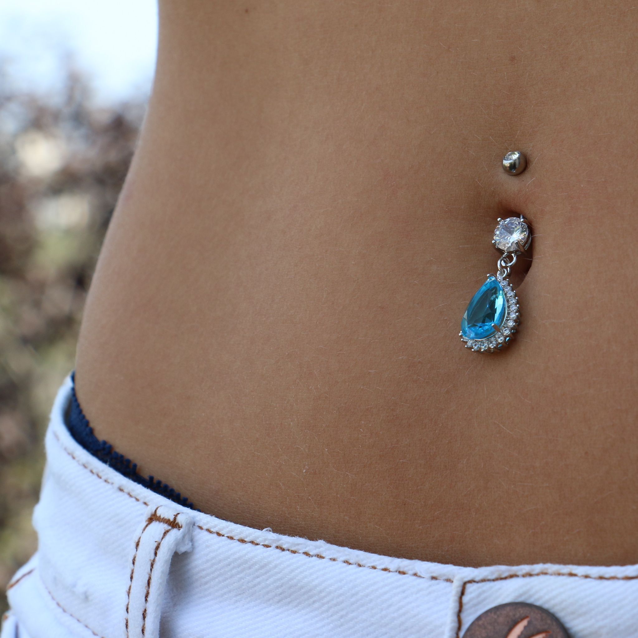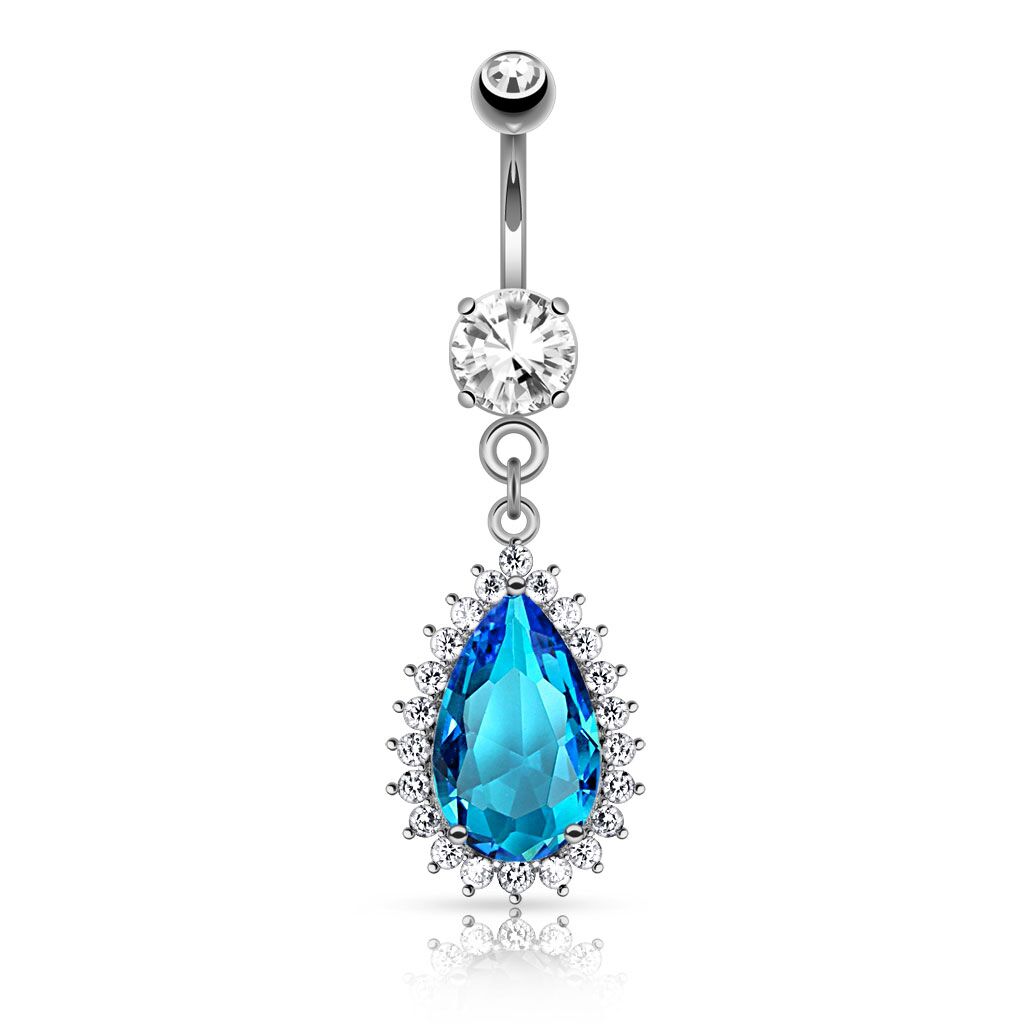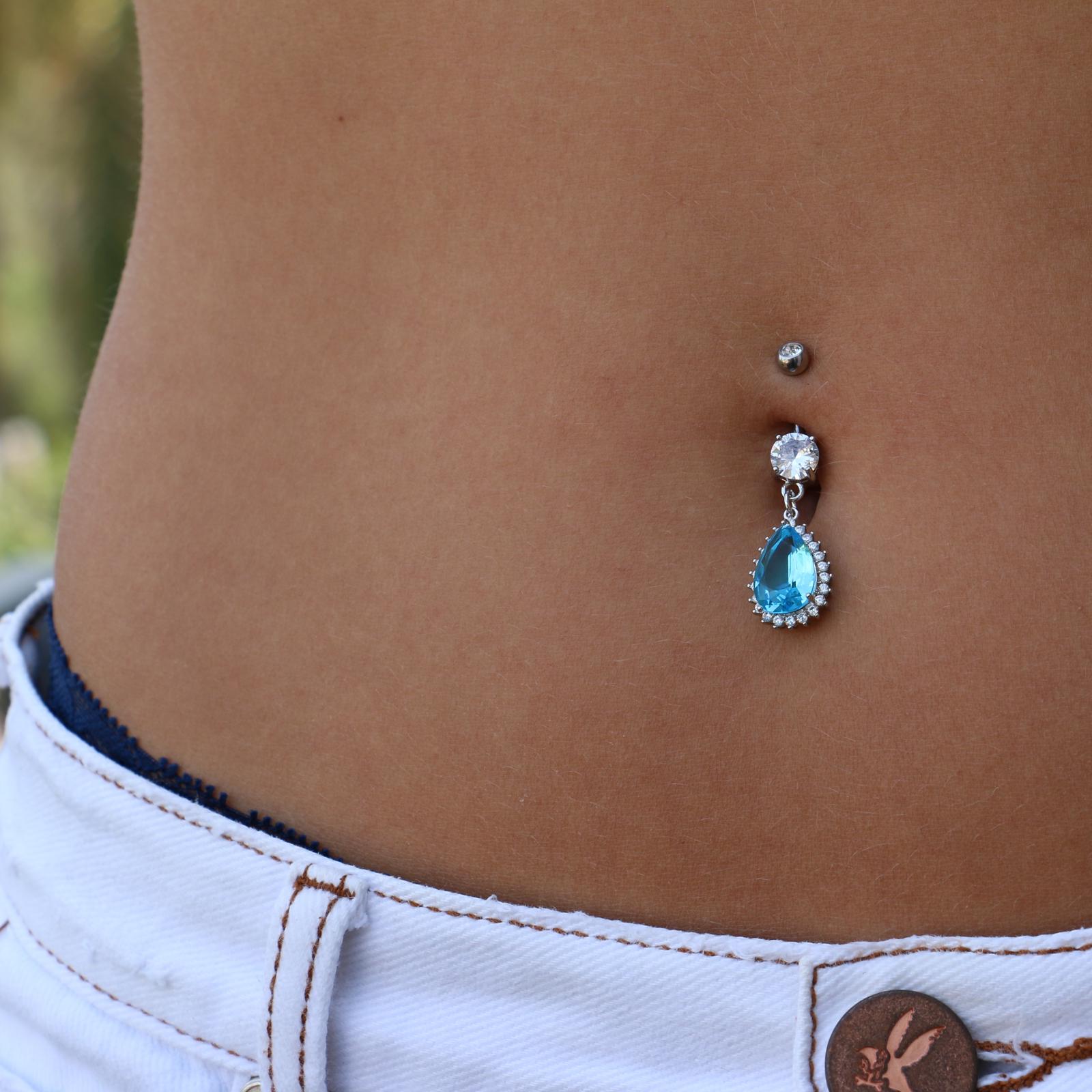 עגיל פירסינג בטבור – טיפה תכלת וקריסטלים לבנים