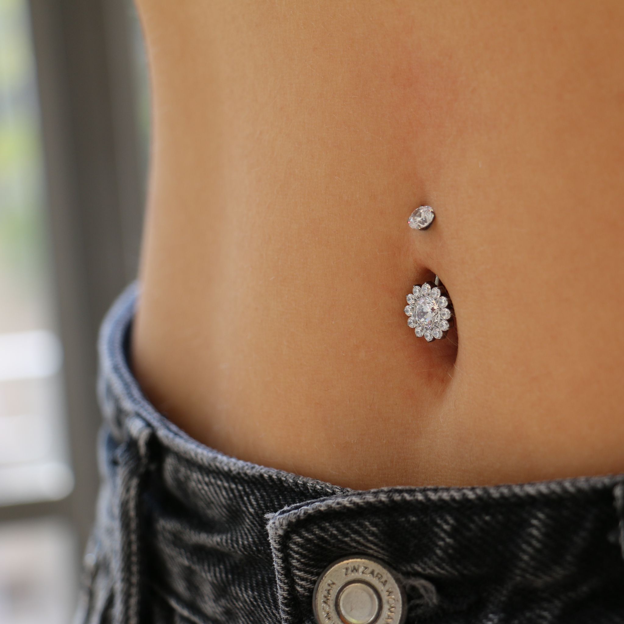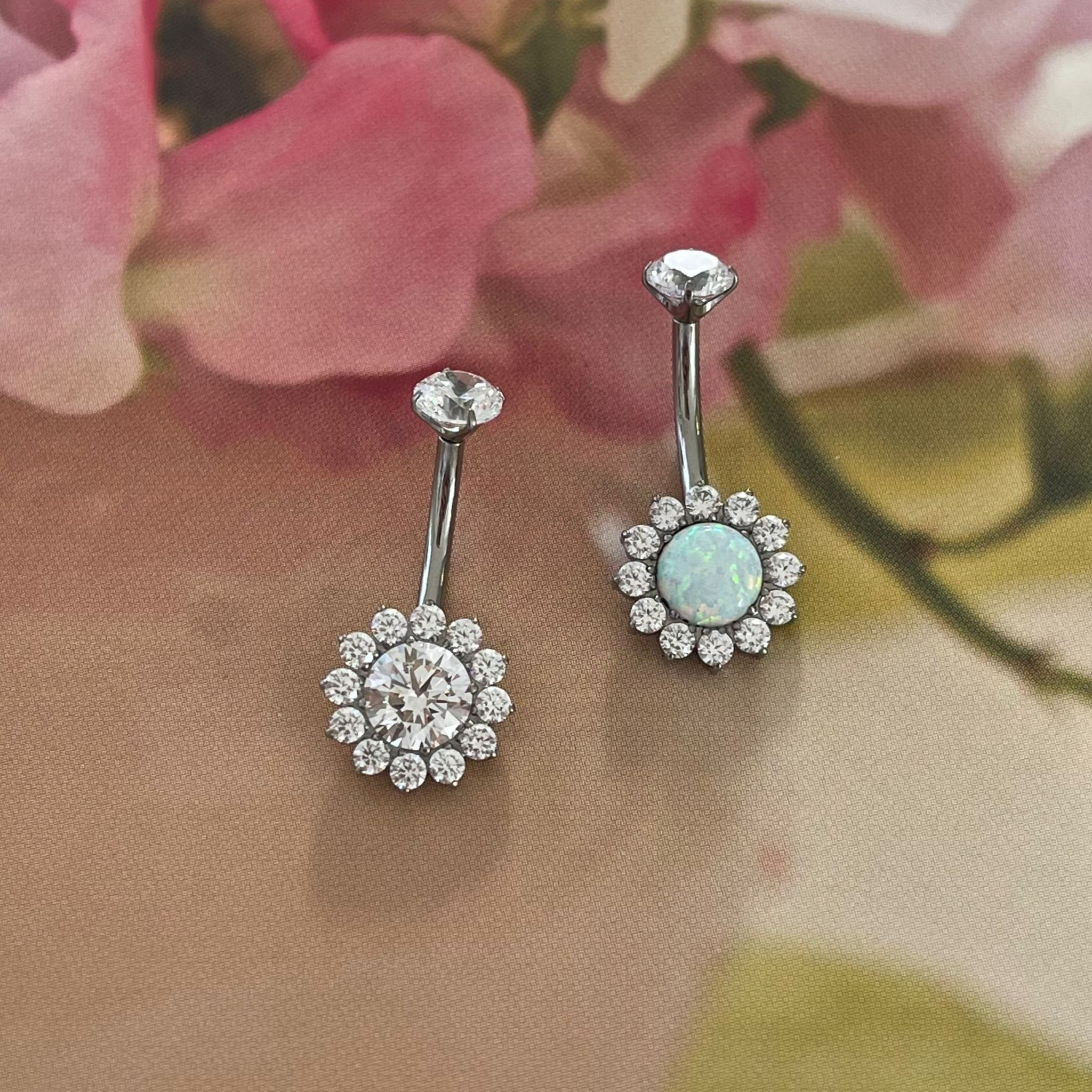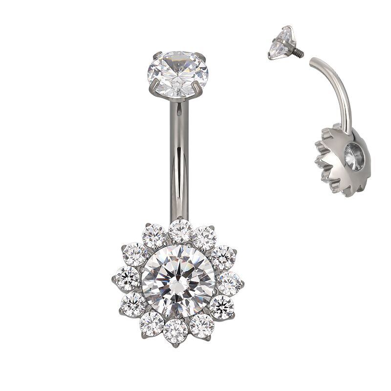 עגיל פירסינג בטבור מטיטניום – פרח עם קריסטלים לבנים