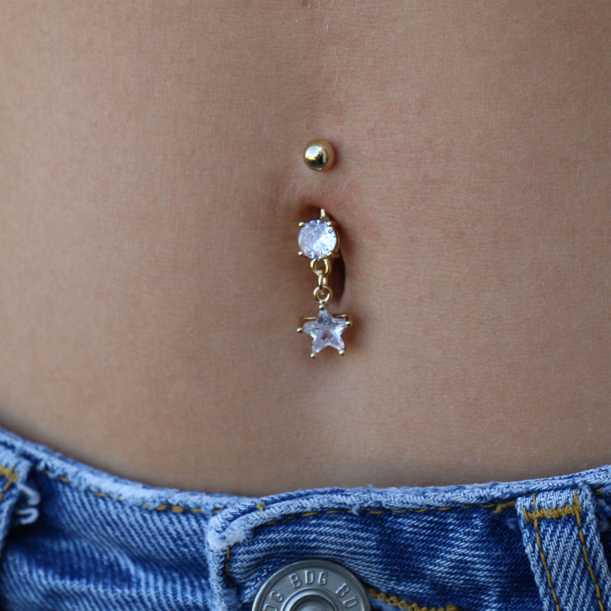עגיל פירסינג בטבור מציפוי זהב – זירקונים עיגול וכוכב