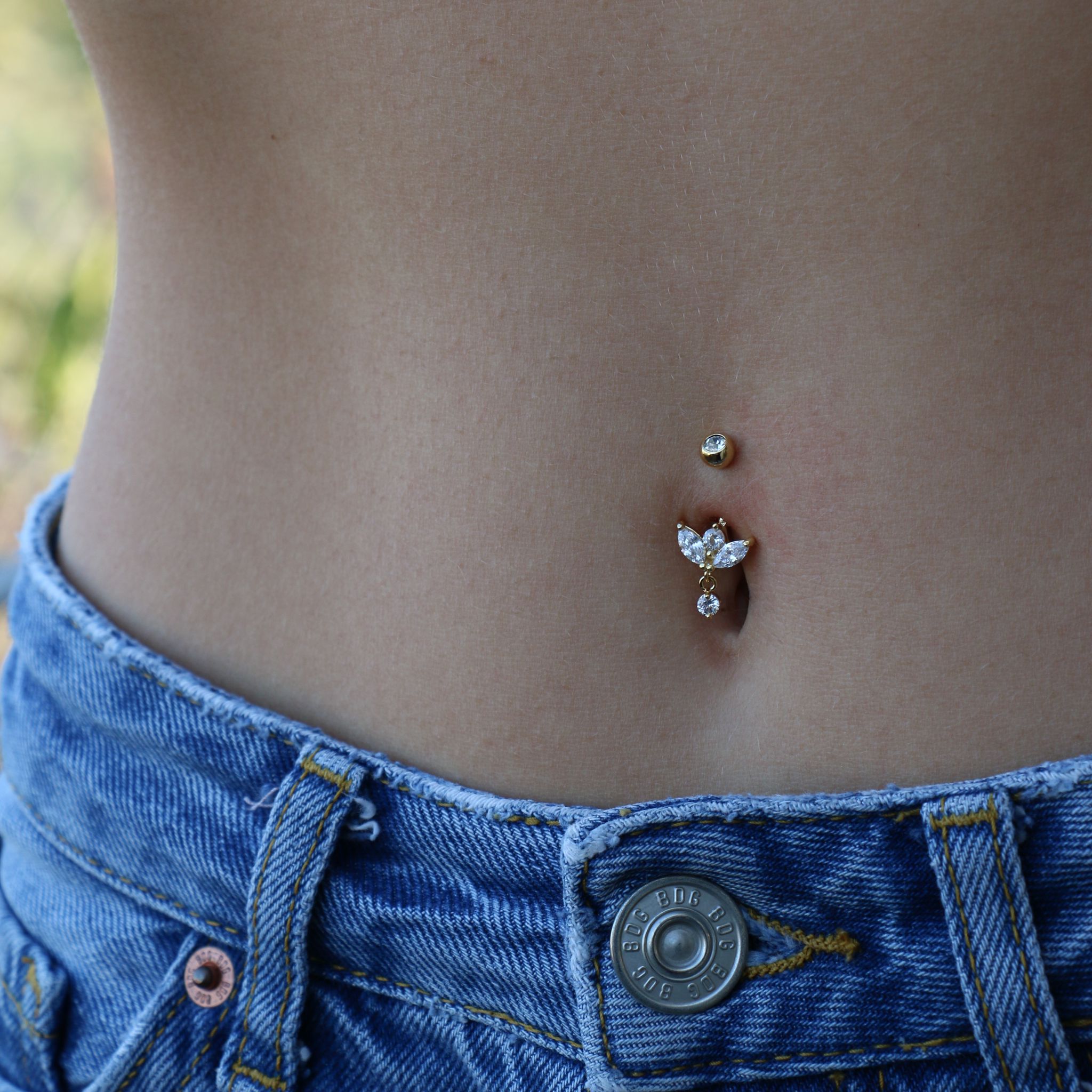עגיל פירסינג בטבור מציפוי זהב – לוטוס וקריסטלים מרקיזים לבנים