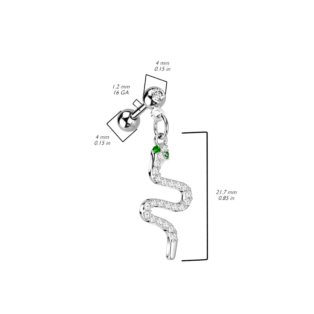 עגיל פירסינג הליקס – נחש עם עיניים ירוקות וקריסטלים לבנים