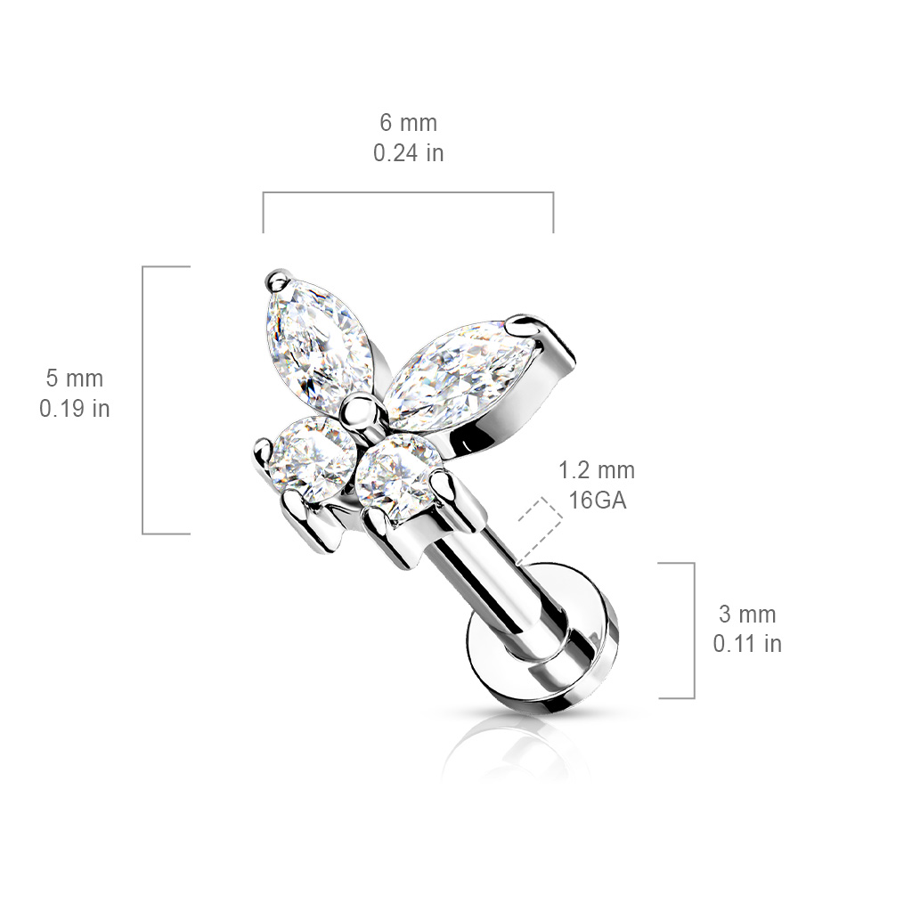 עגיל פירסינג טראגוס / הליקס / קונץ' / פלאט – פרפר עם קריסטלים לבנים