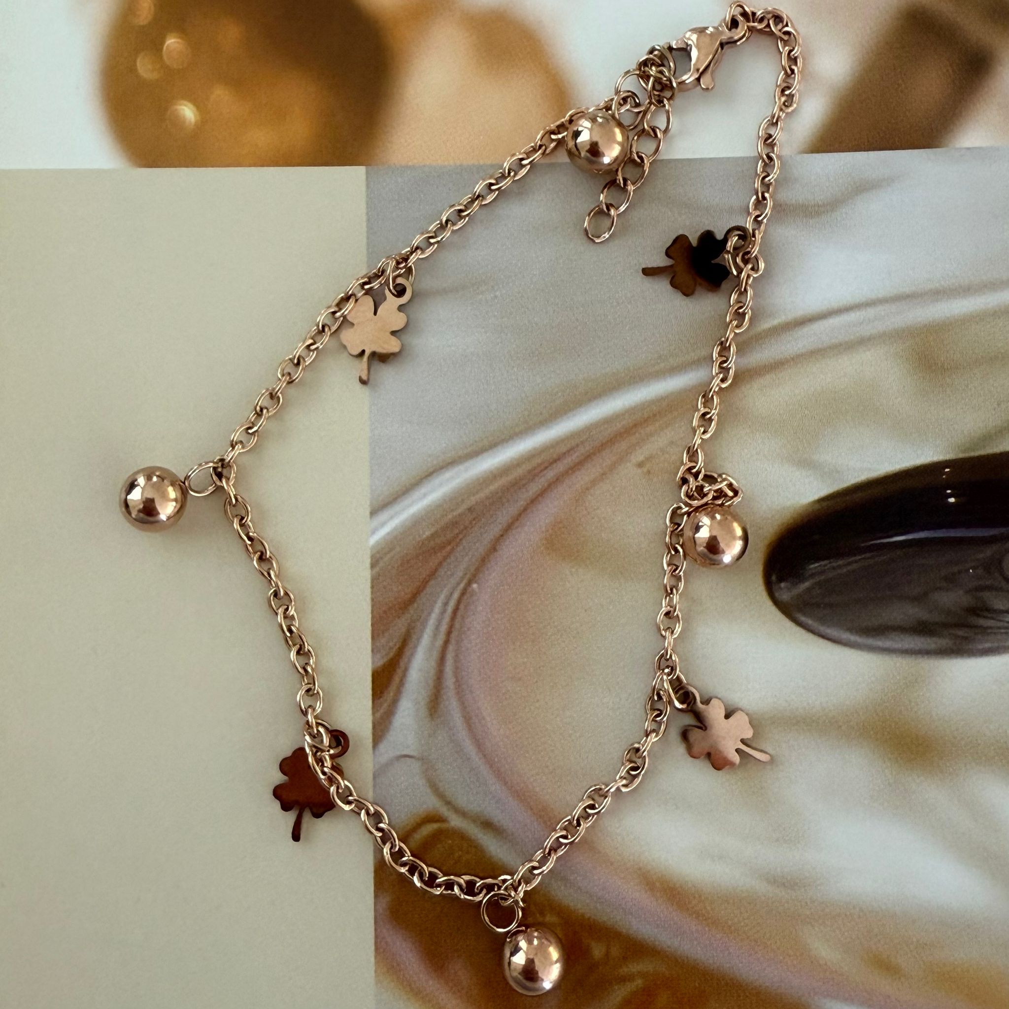 צמיד רגל מסרג'יקל סטיל וציפוי זהב רוז – תלתנים וכדורים